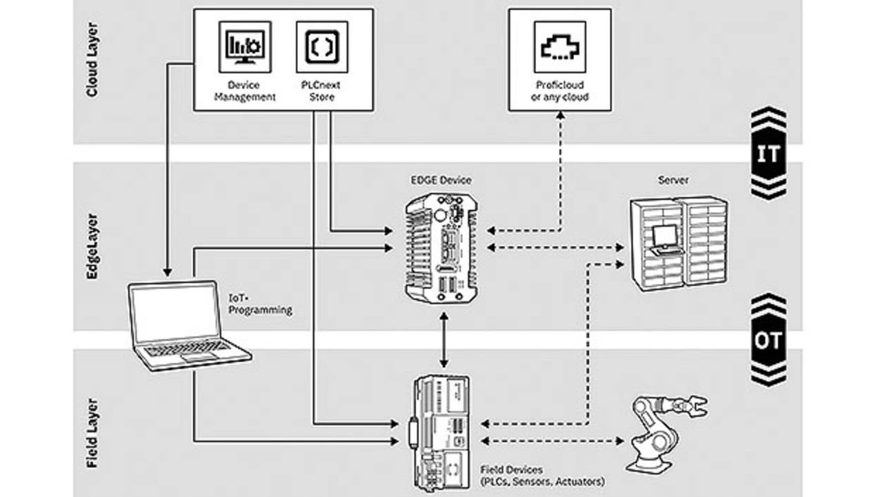 Der Edge-PC verbindet die IT- und OT-Layer. Die Datenverarbeitung erfolgt am Rand des Netzwerks, anstatt große Datenmengen in eine Cloud zu senden, in der die Daten dann verarbeitet und bewertet werden müssen. Wenn Daten lokal und gleich im Edge-PC verarbeitet werden, sinkt die Bandbreitenauslastung des Netzwerks, während zugleich eine schnellere Ausführung sichergestellt ist und Verzögerungszeiten kürzer werden. Mit einer traditionellen SPS lassen sich Daten allerdings nicht vorverarbeiten. Daher entwickelt Phoenix Contact aktuell Edge-PCs, die einen Großteil ihrer Sensordaten am Entstehungspunkt sortieren und vorverarbeiten.