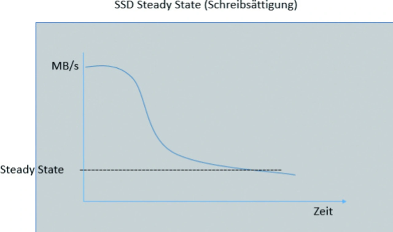 Wer nur die Schreib- und Leseleistung, die in den Datenblättern der Hersteller genannt wird, betrachtet, wird möglicherweise in der Praxis eine Enttäuschung erleben. Der Grund ist, dass das SSD nach und nach im Betrieb langsamer wird. Dieser Aspekt nennt sich Steady-State oder Schreibsättigung und ist leider ein ganz normaler Vorgang aufgrund der internen Struktur, dem internen Handling der SSD-Firmware und der Umgebungstemperatur, bei der das SSD seine Arbeit verrichtet. Hat der Hersteller zum Beispiel kein Reserve-Flash eingebaut oder ist die Firmware nicht optimal programmiert, kann sich die Schreibgeschwindigkeit um 30 % bis 50 % des Wertes aus dem Datenblatt einpendeln. Das heißt von beispielsweise angegebenen 450 MB/s, die das SSD wahrscheinlich am Anfang erreichen wird, fällt diese dann in der Praxis auf 250 MB/s bis 300 MB/s.