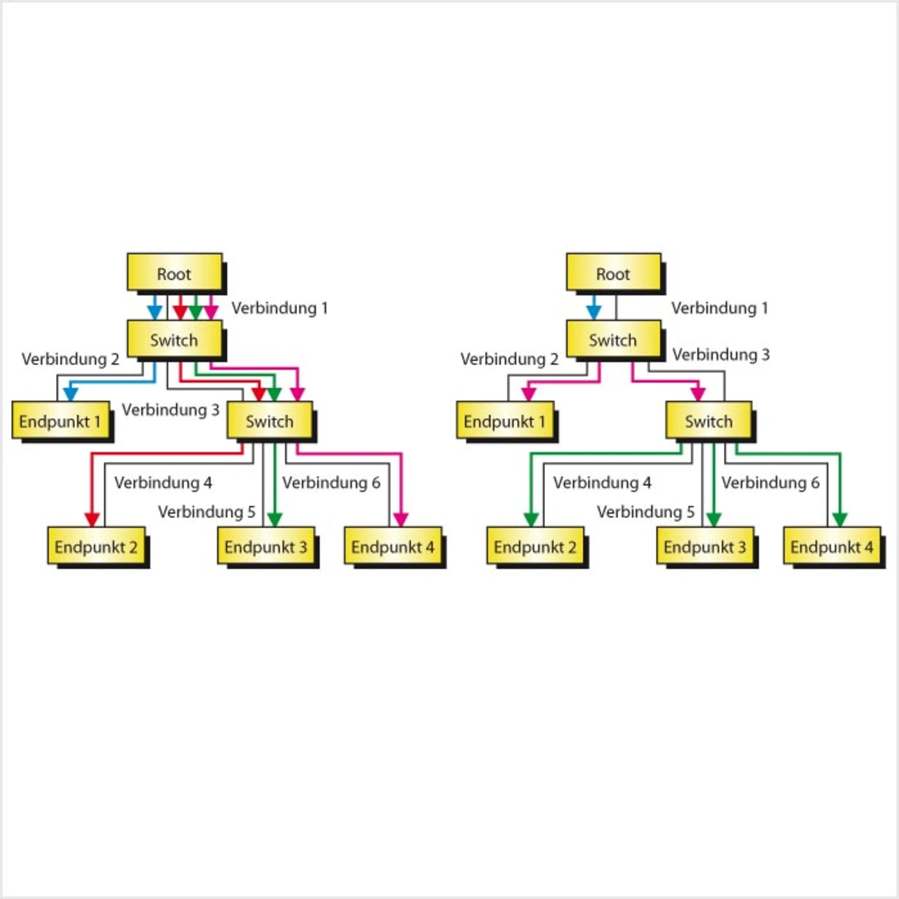 Bild 1 zeigt, wie sich bei einer Multicast-Übertragung der Overhead verringern lässt. Eine Umstellung der wiederholten Unicast-Transaktionen auf eine einzige Multicast-Transaktion optimiert nicht nur die Nutzung der Systemressourcen, sondern senkt auch die Bereitstellungs-Latenz und verbessert damit die Datenkohärenz zwischen den Systemteilnehmern. Wenn man annimmt, dass eine sequenzielle Datenübertragung in indexierten Zyklen erfolgt, dann ergibt ein erneuter Blick auf das einfache Modell oben in Bild 1, dass der vierte Endpunkt erst dann auf dem gleichen, aktuellen Datenstand wie der erste Endpunkt ist, wenn alle dazwischenliegenden Iterationen abgeschlossen sind. In einem Single-Root- System ist eine solche Lücke relativ harmlos, weil die meisten Daten von dem einzigen Host ausgesendet werden und die vier dargestellten Transaktionen abgeschlossen wären, bevor weitere Aktionen stattfänden. Bei Systemen mit dezentraler Intelligenz und nennenswertem Peer-to-Peer-Datenverkehr führen diese Verzögerungen aber potentiell zu Problemen mit der Datenkonsistenz, weil die Datenpakete zu unterschiedlichen Zeiten bei jedem der Endpunkte ankommen. Wenn es sich bei den Daten, die per Schleife an die Endpunkte gesendet werden, um ein Update für eine Routing-Tabelle für jede der vier Network Processing Units (NPUs) handelt, dann haben die Tabellen-Updates an jedem Endpunkt eine andere, zunehmende Latenz. Dies würde zu Fehlern im Routing führen. Daten-Multicasting führt zu einer besseren Auslastung der Verbindungen im gesamten System. Es kann Flaschenhälse eliminieren und die Übertragungsleistung erhöhen. Das PCI-Express- Multicast-Protokoll erzeugt Datenkopien nur bei „Verzweigungen“. Bild 2 zeigt eine aus zwei PCIExpress- Switches bestehende, zweistufige Verbindungsstruktur. Schickt man Unicast-Daten an die Endpunkte 1 bis 4, so durchqueren die gleichen Daten mehrmals die Verbindungen 1 und 3 (linke Abbildung). Das rechts abgebildete System nutzt die Multicast-Funktion und überträgt die Daten auf jeder Verbindung nur einmal, wobei die Datenverteilung überall dort von der Multicast- Funktion gesteuert wird, wo die Daten logisch kopiert werden müssen.
