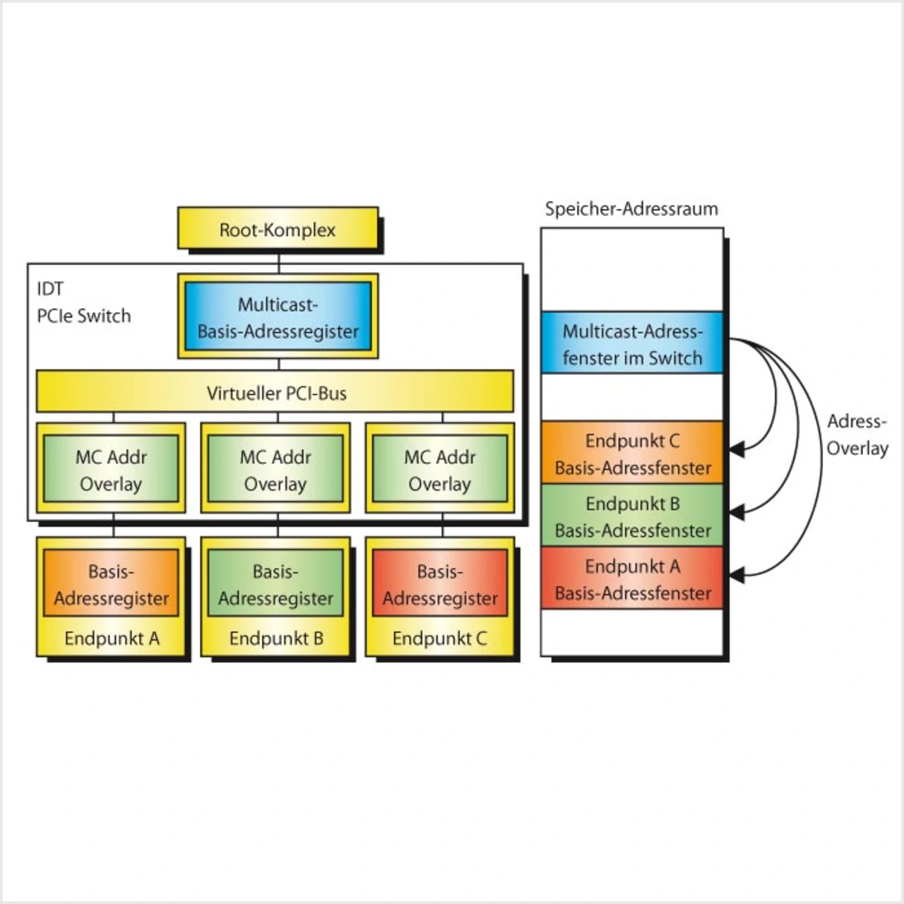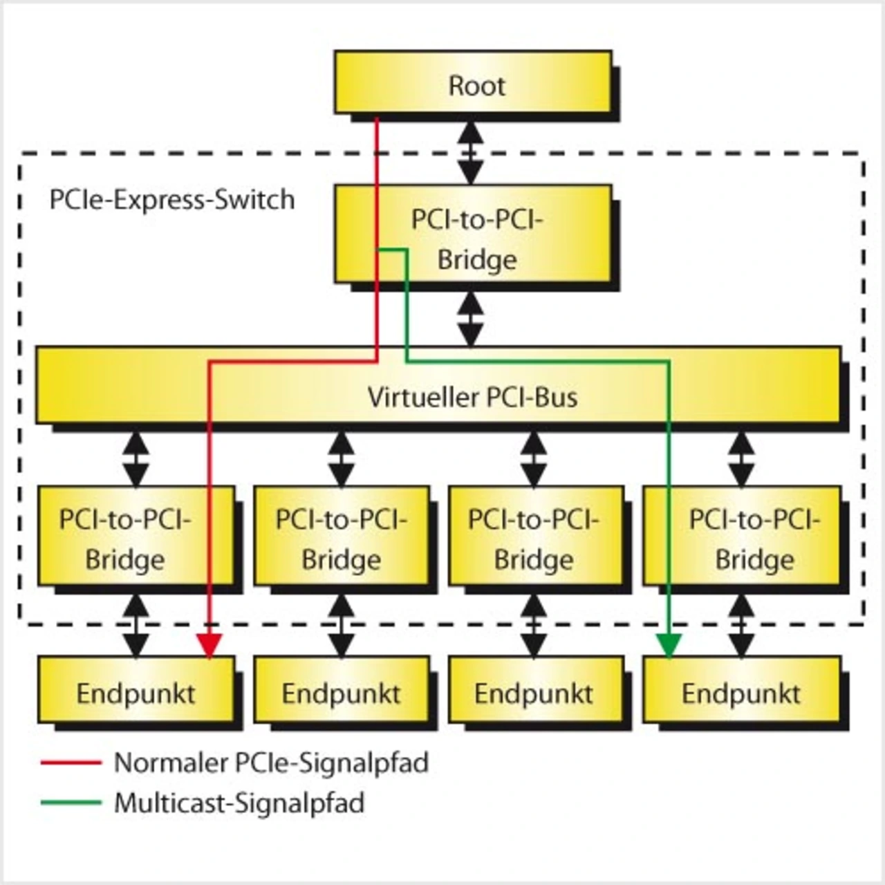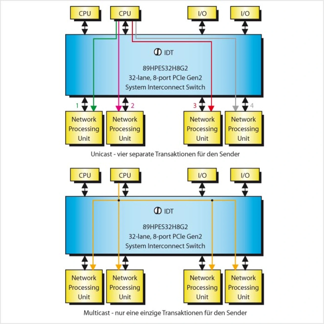 Die neue Multicast-Erweiterung der PCI-Express-Spezifikation sorgt für eine effektivere Verteilung derselben Daten an mehrere Empfänger und verringert Probleme mit der Datenkonsistenz. PCI-Express-Roots und -Endpunkte müssen dazu nicht einmal geändert werden – es sind zwischengeschaltete Switches, die die Multicast-Fähigkeit in jedes System bringen können.