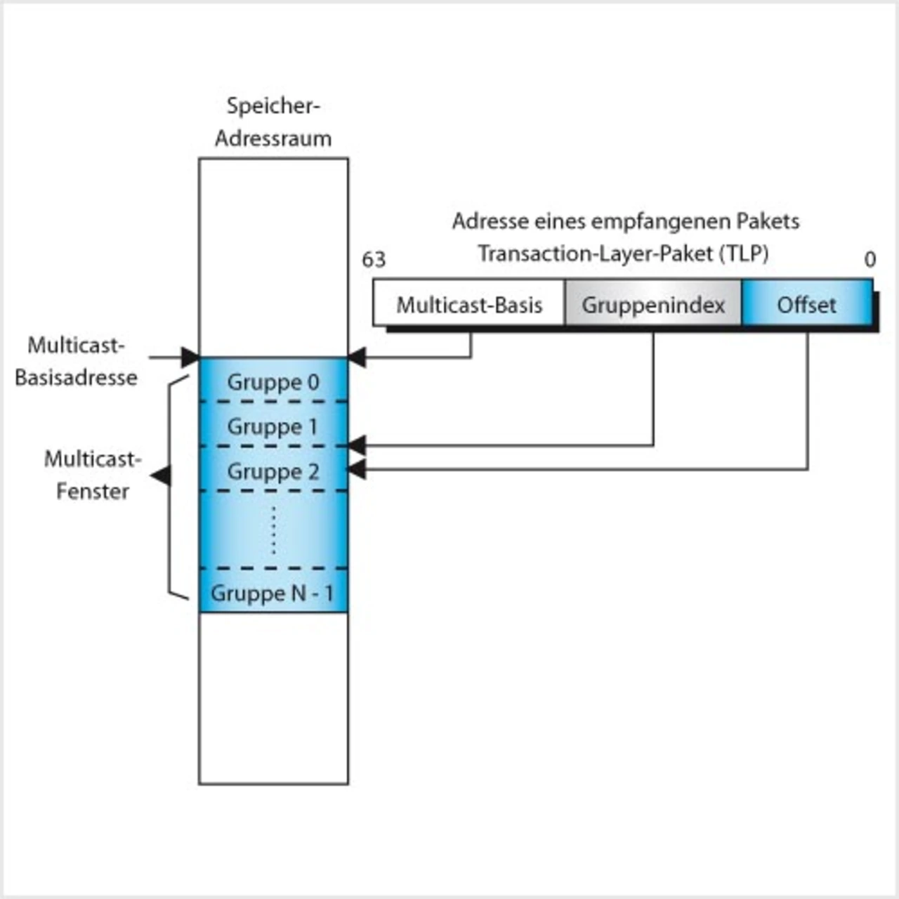 Diese Pakete sind Transaktionen, die auf Speicher-Schreibzugriffen beruhen. Sie können an mehrere Empfänger in bis zu 64 Multicast-Gruppen (MCGs) versendet werden. Der bisherige Unicast-Verkehr wird realisiert, indem eine MCG nur ein Mitglied enthält. Sobald eine MCG jedoch aus zwei oder mehr Mitgliedern besteht, hat das neue System nur Vorteile. Weil an den „Roots“ aus ompatibilitätsgründen keine Veränderung erfolgen darf, muss man für die Herstellung einer Verbindung zwischen dem Initiator und den MCG-Mitgliedern einen PCI-Express- Switch (oder eine Serie von Switches) verwenden. Jeder beliebige Baustein in der PCI-Express- Hierarchie kann Multicast- Traffic anstoßen, und der Traffic lässt sich an beliebig viele Teilnehmer übertragen, die mit einem multicast-fähigen Switch verbunden sind. Ein multicast- fähiger Switch für jeden Port kann Datenpakete von jedem seiner Ports an alle restlichen übertragen. Root-Strukturen und Endpunkte können die Vorteile aus der Einbindung multicast-fähiger Strukturen nutzen. Dies ist aber ein optionales Merkmal für diese Bausteine. Entsprechend der nicht von der Einbindung der Multicast-Fähigkeit betroffenen System-Enumeration konfiguriert die System-Software den Multicast- Adressraum. Dazu erstellt sie ein „Multicast-Fenster“ im PCI-Express- Speicherbereich, das an einer Basisadresse beginnt (Bild 3).