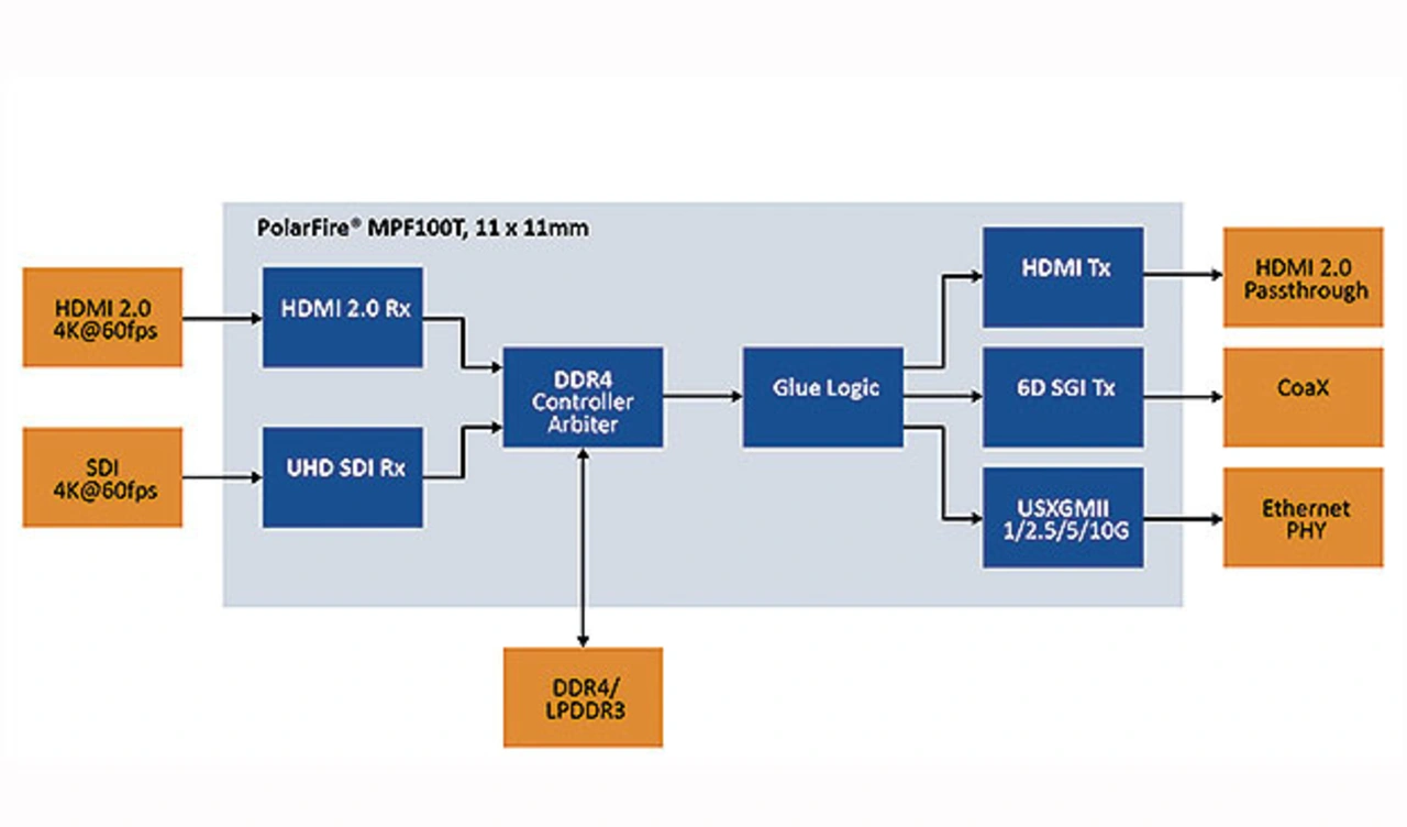 Zudem unterstützen die Konverter verschiedene Protokolle wie HDMI, CoaXPress, SDI sowie verschiedene Ethernet-Protokolle. Hierbei kommen Multi-Gigabit-Transceiver, die auf Datenraten bis zu 12,7 Gbit/s optimiert sind, zum Einsatz. Zusätzlich kann der Formfaktor der Konverter kompakt gehalten werden, da Kühlkörper und Lüfter nicht mehr erforderlich sind. Auf der PolarFire-Technik basierende Videokonverter nehmen typischerweise weniger als 2 W auf (Bild 4).