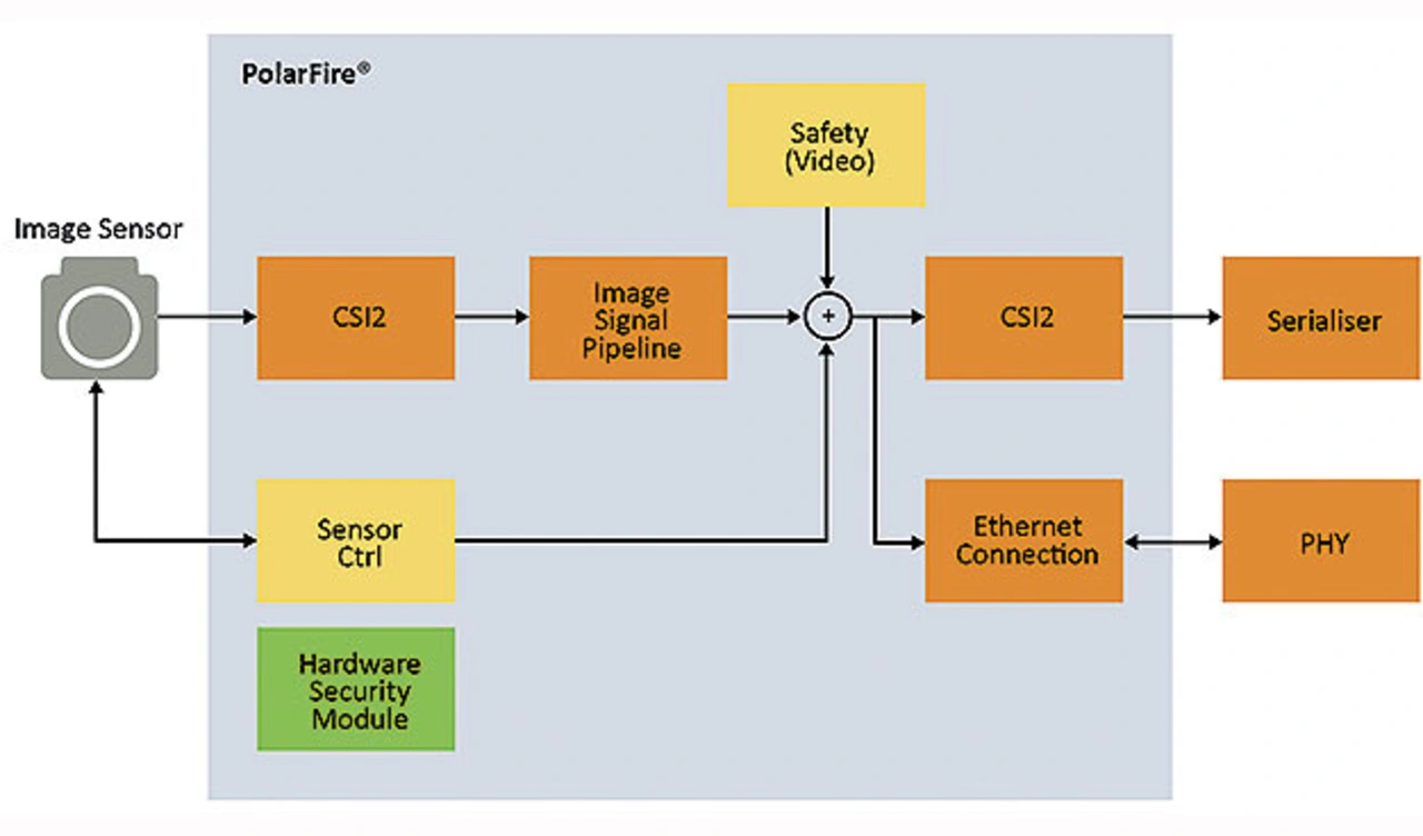 Die Systeme stellen hohe Anforderungen an funktionale Sicherheit, Security und Verarbeitung mit geringer Latenz. Weiterhin wichtig ist eine zuverlässige Funktion bei hohen Temperaturen, verursacht von der Motorwärme oder der Sonne. Bild 7 zeigt einen Systemaufbau mit dem PolarFire FPGA »MPF050T« – Systemelemente für funktionale Sicherheit sind in gelber Farbe gekennzeichnet, Security-Komponenten in grün. Der integrierte sichere nichtflüchtige Speicher (sNVM) ermöglicht die Speicherung von Flottenschlüsseln zum Authentifizieren im Fahrzeugnetz innerhalb des Kameramoduls. Empfangene Bilddaten werden im Streaming-Modus verarbeitet, möglich ist das mit den parallelen Hardwarestrukturen der FPGA-Architektur. Zusätzlich können Anwender Zusatzinformationen wie Frame-Nummer oder Integritätschecks, zum Beispiel Cyclic Redundancy Checks (CRCs), hinzufügen, um die Kommunikation über die Schnittstelle mit dem zugehörigen Steuergerät abzusichern.