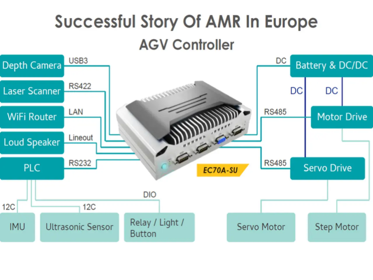 Die Leistung der Core CPU der 6. und 7. Generation ermöglicht einem AMR das Berechnen von Algorithmen für Machine Vision und Kartenrekonstruktion in Echtzeit. Zudem erleichtert der x86-Befehlssatz das Entwickeln der Software sowie das Anpassen der grafischen Benutzeroberfläche (GUI). So ist der AMR beispielsweise direkt von einem entfernten Computer oder sogar einem Smartphone über ein drahtloses Netzwerk zu bedienen. Hiermit ist keine komplizierte Konsolenverwaltung erforderlich. Die IPC-Serie treibt den AMR mit geringer Leistungsaufnahme an und erreicht mit einer Batterieladung eine lange Betriebszeit von 8 bis 10 Stunden und eine Reichweite von bis zu 20 km, außerdem eine maximale Geschwindigkeit von 2,0 m/s.