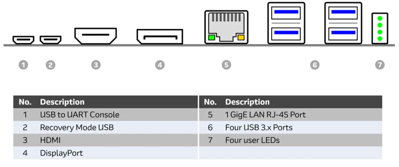 Das Carrier Board unterstützt die für die Endgeräte der Benutzer geeigneten Verbindungsoptionen. Für die Anbindung von drahtlosen WiFi- und Bluetooth-Netzwerken steht den Entwicklern die M.2-Key-E-Buchse bereit. Stationäre Applikationen lassen sich über die RJ45-Buchse mit 1 Gbit/s für kabelgebundenes Ethernet an der Rückseite anschließen. Mobilfunkmodems und Global Navigation Satellite System (GNSS)-Entwicklungskits sind in der Regel über einen der zahlreich vorhandenen USB-Anschlüsse zugänglich.