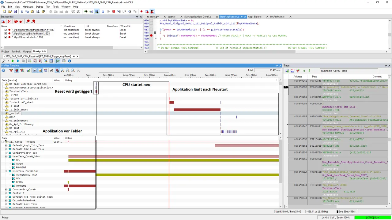 Auf den ersten Blick läuft die Anwendung – Vector MICROSAR – mit einem Infineon Aurix-TC399XE-Mikrocontroller auf einem iSystem Evaluierungsboard – einwandfrei, jedoch vermutet der Entwickler, dass es sporadische Resets gibt. Um den Verdacht zu bestätigen, setzt der Anwender einen Haltepunkt am Startsymbol innerhalb von winIDEA. Tatsächlich bleibt die Anwendung nach ein paar Augenblicken an der Reset-Vektor-Adresse stehen. Der Call-Stack ist nach einem Reset leer und deshalb nicht hilfreich für die Ursachensuche. Wie ebenfalls das Register der Reset Control Unit (RCU) bestätigen würde, handelt es sich um einen Applikations-Reset, dessen Ursache mit interaktivem Debugging lediglich schwer zu finden wäre. Hier hilft wiederum Tracing.