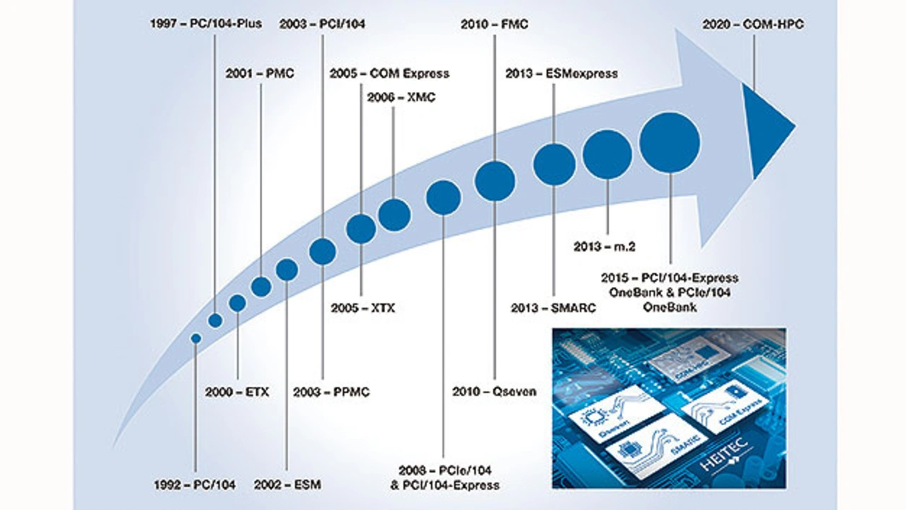 Aufsteckmodule – genauer Computer-on-Modules (CoMs) – haben inzwischen den Markt erobert, denn ihre Vorteile zeigen sich sehr schnell: Zusammen mit einem Träger-Board kann ein Entwickler ein CoM passgenau in eine Anwendung implementieren – und das mit geringem Aufwand und niedrigen Kosten. Das reichhaltige Angebot am Markt birgt viele Optionen – jedoch hat der Entwickler hiermit ebenso die Qual der Wahl zwischen verschiedenen Standards und Anbietern. Bild 1 zeigt, welche Standards zu welcher Zeit entstanden sind.