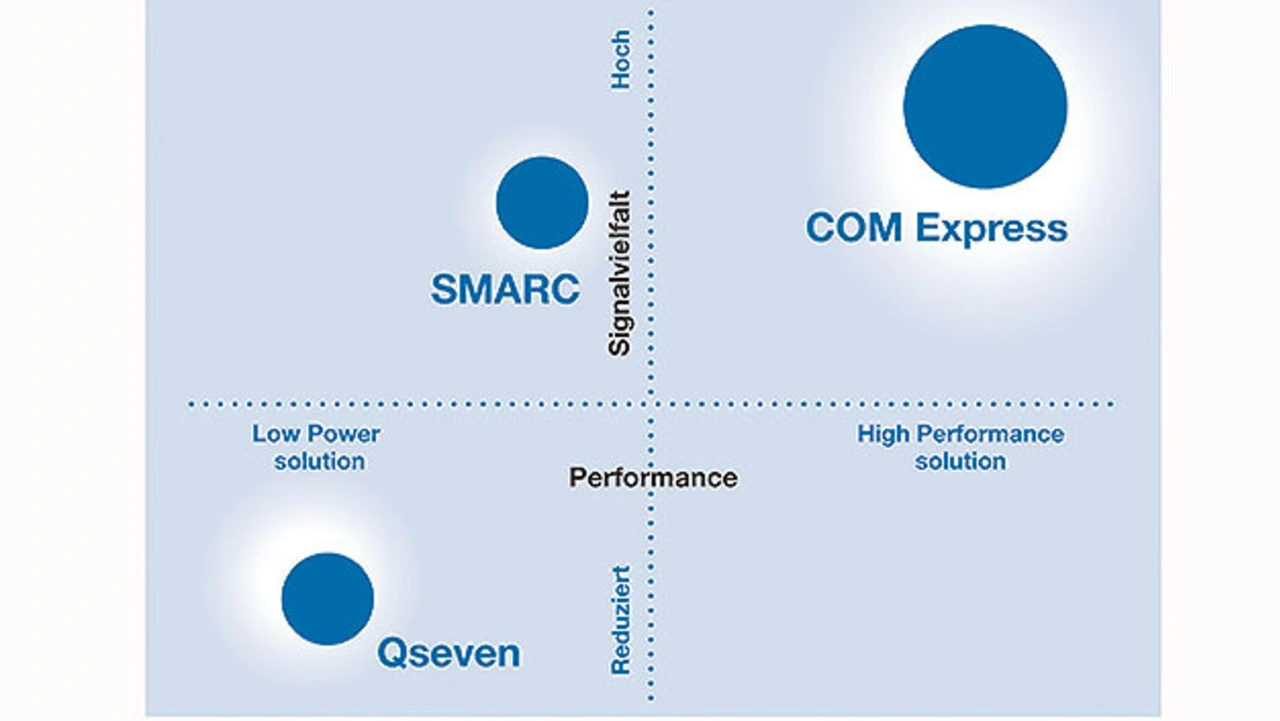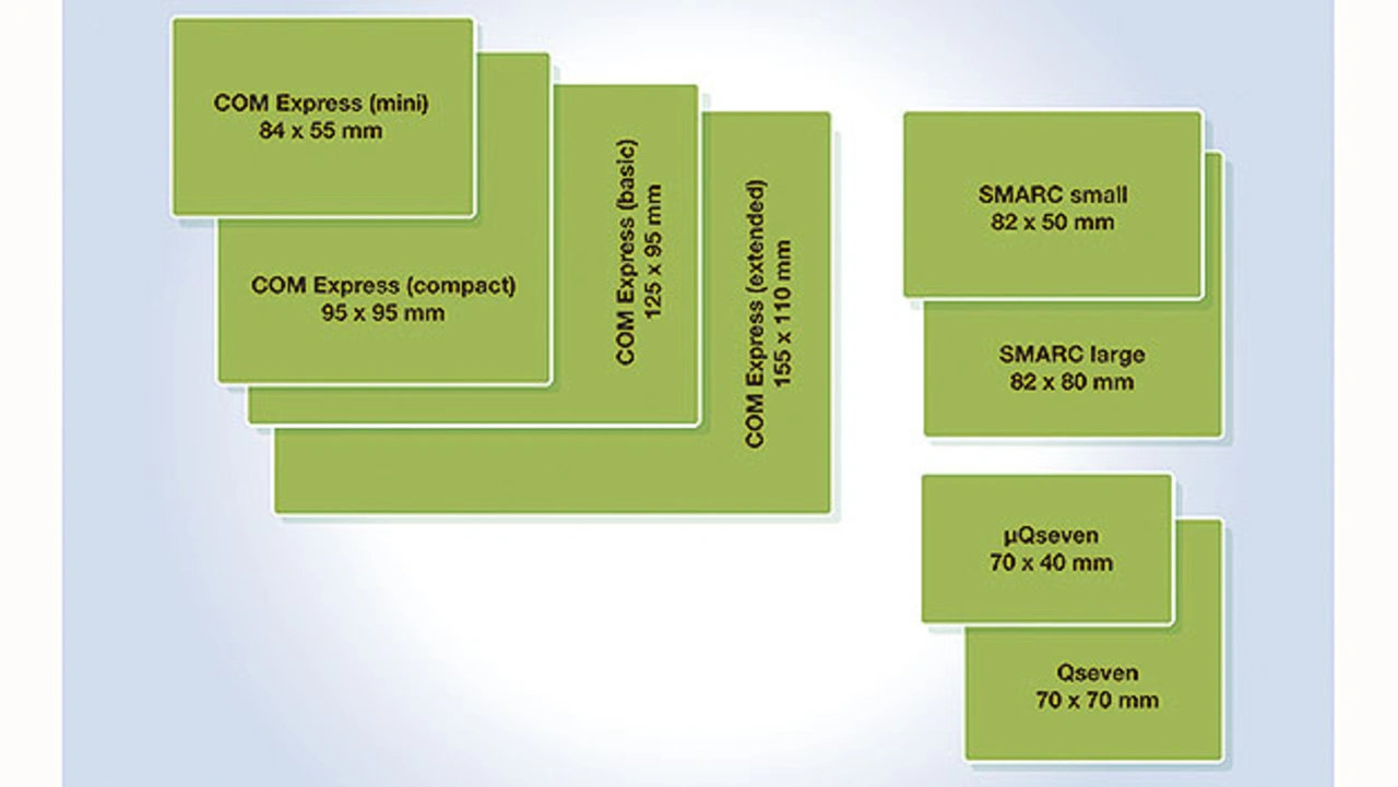 Einen Vergleich mit SMARC und Qseven zeigt Bild 2. COM Express definiert eine Familie von »Small Form Factor« (SFF)- und CoM Single-Board-Computern (SBCs), die die nötige Leistungsvielfalt liefern und genau auf die jeweiligen Bedürfnisse adaptierbar sind. COM Express wurde für die aktuellen Chipsätze und seriellen Signalisierungsprotokolle konzipiert. Es schließt PCI-Express der dritten Generation, 10 GbE, SATA, USB 3.0 sowie hochauflösende Videoschnittstellen – etwa für das Erfassen der Umgebung – mit ein.