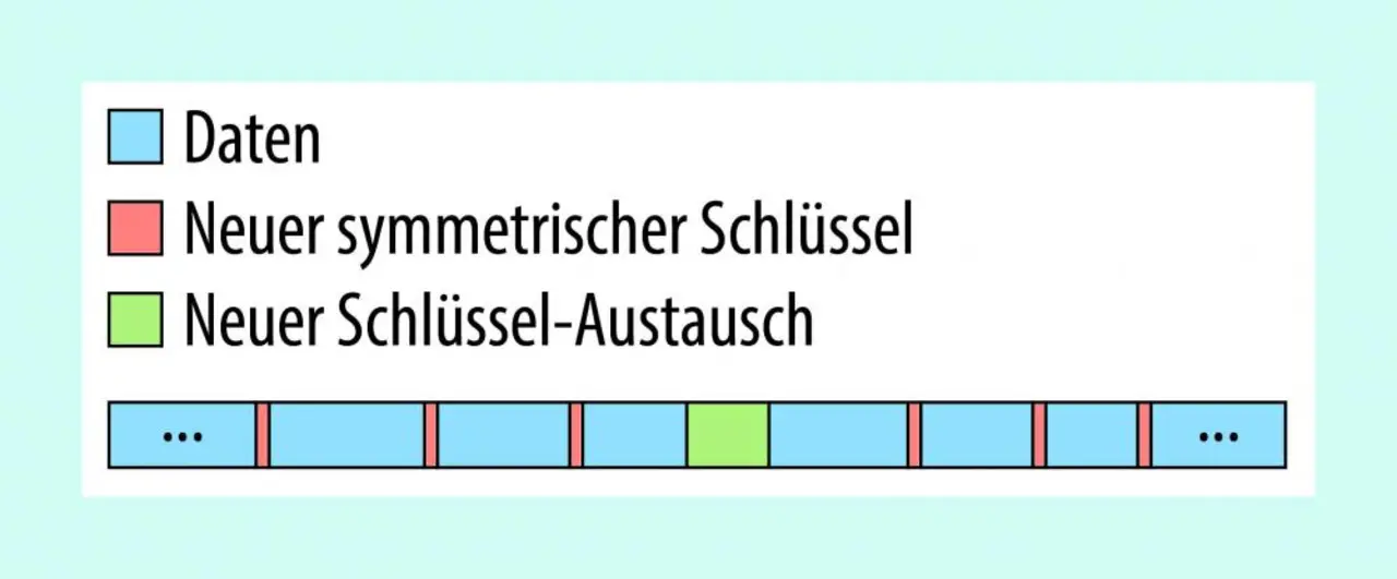 Bild 1 zeigt ein Kommunikationsprotokoll, bei dem der symmetrische Schlüssel sehr oft (alle 1 ms) verändert wird, indem der Sender einfach in festgelegten Intervallen einen neuen zufälligen symmetrischen Schlüssel erzeugt und ihn als Teil der verschlüsselten Daten sendet. Nach dem Senden wechselt die Verbindung zum neuen Schlüssel. Erhalten Angreifer Zugriff auf einen symmetrischen Schlüssel, können sie alle zukünftigen Nachrichten lesen, da sie den nächsten Schlüssel mit dem geknackten Schlüssel entschlüsseln können. Doch das kann verhindert werden: In größeren Abständen, zum Beispiel jede Sekunde, wird ein teurer Austausch asymmetrischer Schlüssel eingeführt. Das stellt sicher, dass bei einem geknackten Schlüssel die Daten nur 1 s lang vom Angreifer dekodiert werden können.