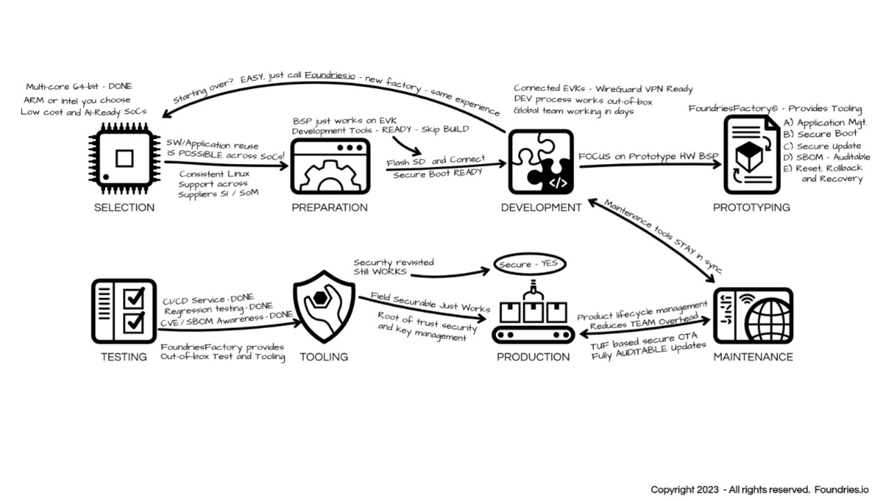 Mit der Implementierung der Produktentwicklung auf einer DevSecOps-Plattform wie dem Produkt »FoundriesFactory« von Foundries.io (https://foundries.io/products/) können OEM die Risiken bei der Sicherheit und der Produktwartung ausschließen, die sonst durch die natürliche Fragmentierung der organisatorischen Einheiten entstehen.