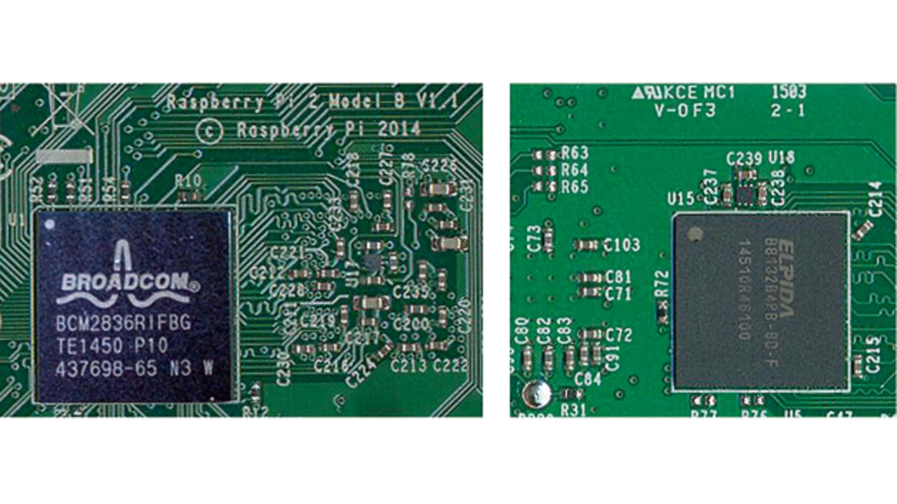 Vom Platinenlayout und den meisten Schaltungskomponenten her entspricht das Pi 2 Model B dem Modell B+. Den wesentlichen Unterschied bildet der BCM2836 der Firma Broadcom, der auf einem ARM Cortex-A7 Quadcore basiert. Er wird mit 900 MHz getaktet und arbeitet mit 1 GB SDRAM. Der Vorgänger BCM2835 ist ein ARMv6 (Single Core), der auf der über zwölf Jahre alten ARM11-Architektur beruht, mit 700 MHz getaktet wird und einen maximalen SDRAM-Speicher von 512 MB unterstützt. Der SDRAM-Speicher befindet sich beim neuen Modell als eigener Chip auf der Platinenrückseite (Bild 1) und wird nicht mehr wie zuvor mit dem Broadcom-SoC in Sandwich-Bauweise zu einem Chip kombiniert. Sowohl zur Peripherie auf dem Board als auch zur Software hin ist das Pi 2 Model B kompatibel zu den Vorgängern. Am integrierten Grafikprozessor (Broadcom VideoCore IV) und auch an den Schnittstellen hat sich nichts geändert.