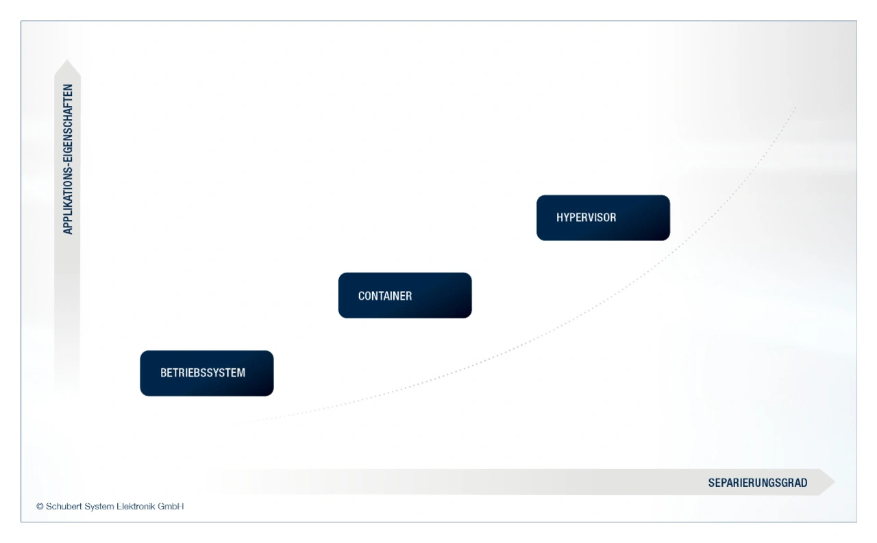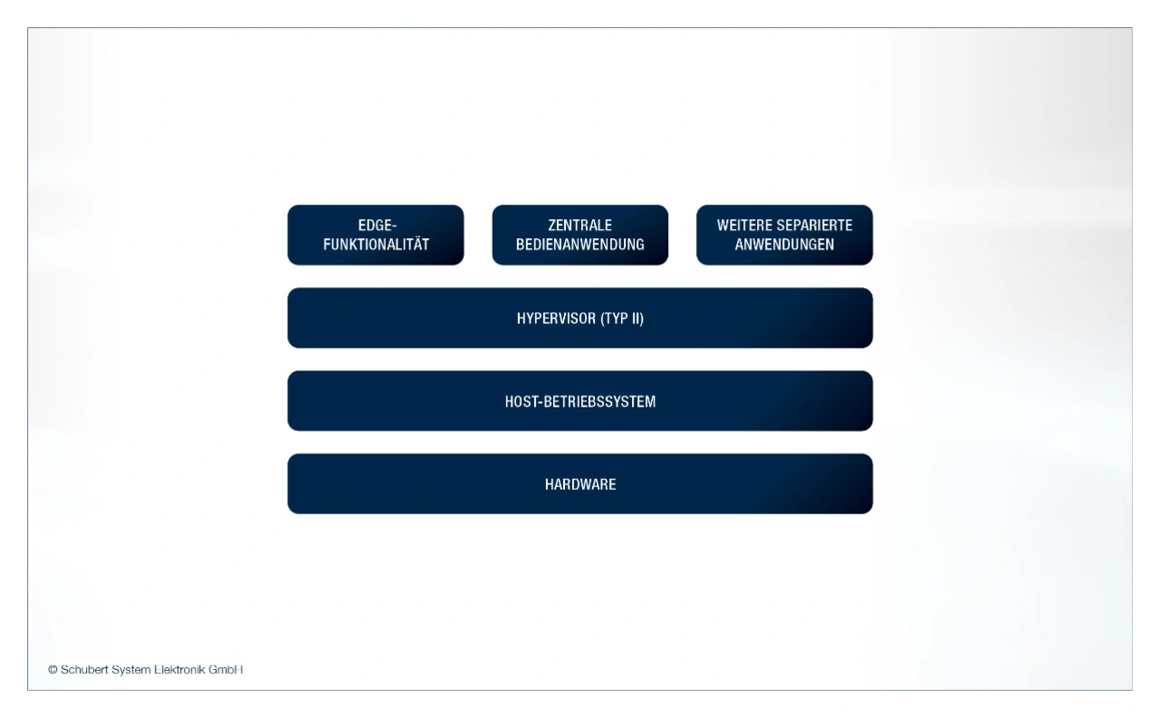 In der weiteren Umsetzung kann ein Separieren über eine eigenständige Hardware oder mit Virtualisierung über einen Hypervisor erfolgen. Ein Hypervisor abstrahiert entgegen einer Containerisierung die vorhandene Hardware für ein gesamtes Betriebssystem und nicht nur die Applikationsschnittstelle auf dem Betriebssystem. Der Hypervisor kann direkt auf der Hardware aufsetzen (Typ 1) oder auf einem Host-Betriebssystem (Typ 2, Bild 4). Das Vorgehen eignet sich dazu, die Anwendung gesamtheitlich virtuell zu kapseln und eine klar strukturierte Systemarchitektur zu erreichen. Weitere Vorteile sind ein höheres Sicherheitspotenzial sowie eine bessere Skalierbarkeit des Systems.