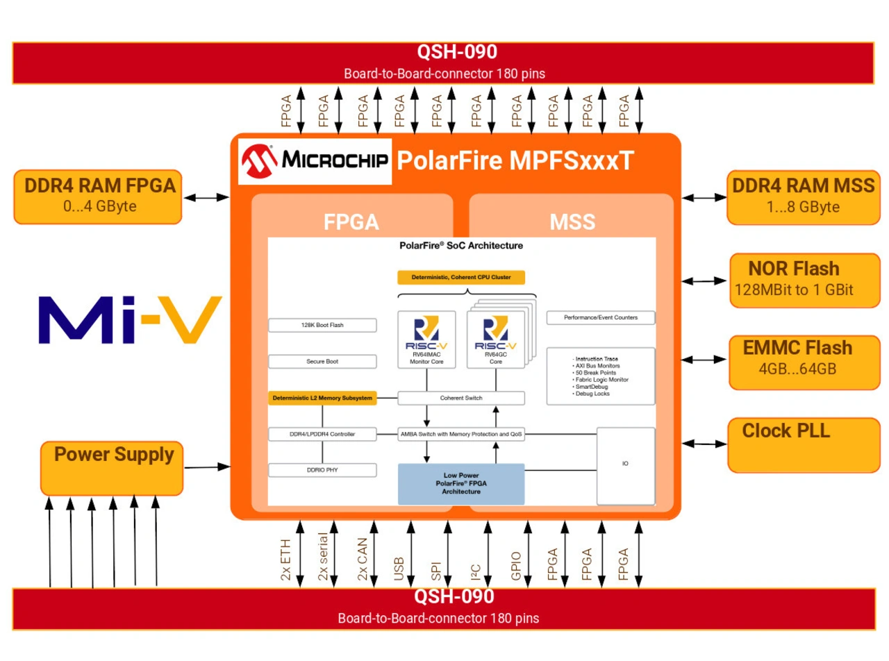Das »M100PFS«-Modul von Aries Embedded erfüllt all jene Anforderungen des Embedded-Marktes (Bild 1). Herzstück des Moduls sind die skalierbaren »PolarFire«-RISC-V-FPGAs der »MPFS«-Familie von Microchip. Sie kombinieren die energieeffizienten FPGAs der PolarFire-Familie mit einem Mikroprozessor-Subsystem (MSS) mit fünf RISC-V-CPU-Kernen mit 625 MHz Taktfrequenz. Hierbei sind die FPGAs folgendermaßen skalierbar: