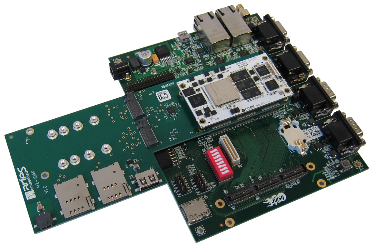 Als Entwicklungsboard hierzu bietet Aries Embedded mit dem 160 mm × 135 mm großen »M100PFSEVP« ein serientaugliches Referenz- beziehungsweise Carrierboard mit umfangreichen Schnittstellen an: