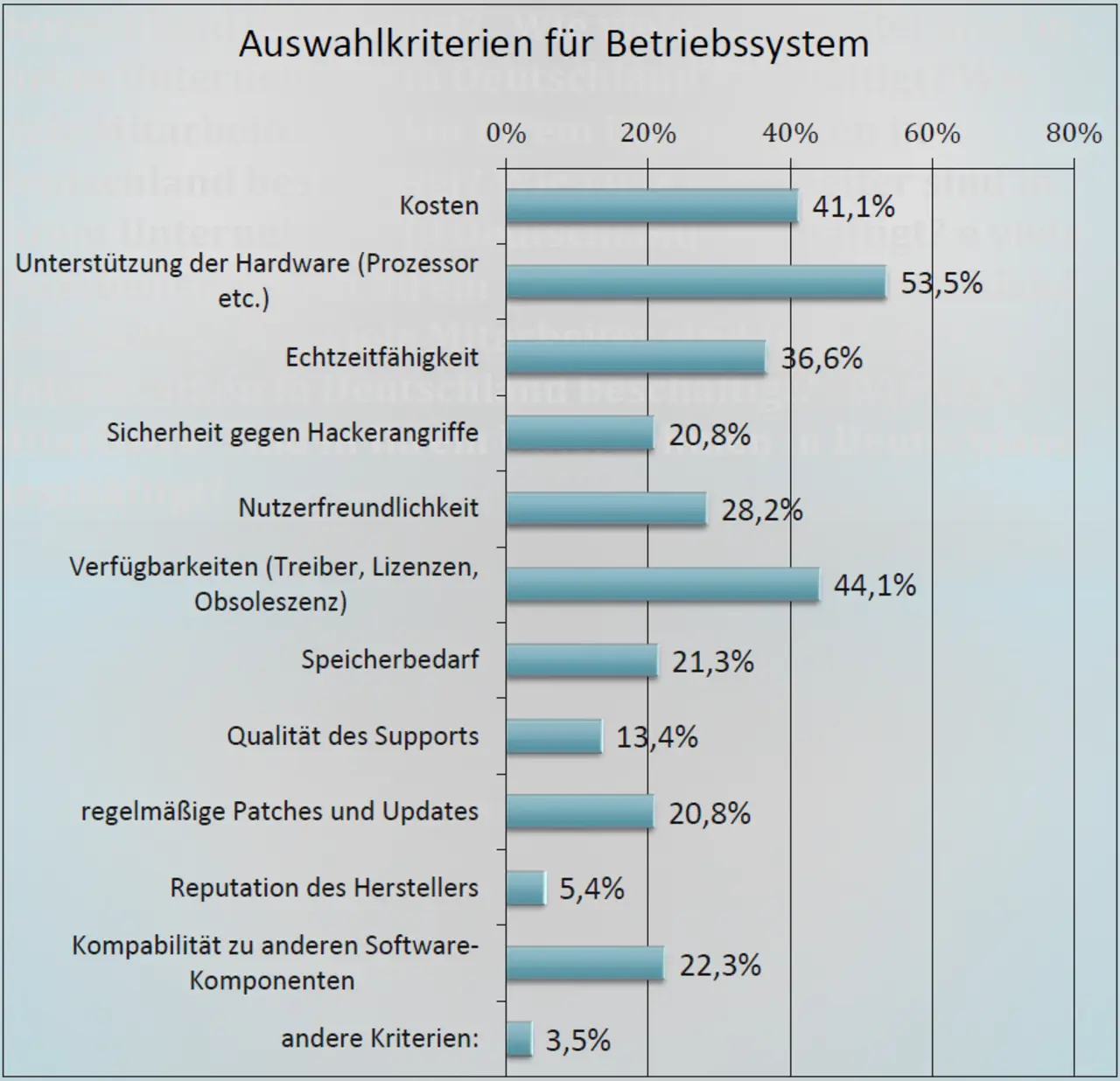 Wichtigste Kriterien für die Wahl eines Betriebssystems sind die Hardwareunterstützung, Verfügbarkeiten – beispielsweise Treiber, Lizenzen und Obsoleszenz – sowie die Kosten (Bild 4). Immer wichtiger werden im Zuge der Vernetzung im IoT außerdem die Echtzeitfähigkeit des Betriebssystems sowie die Sicherheit vor Hackerangriffen.