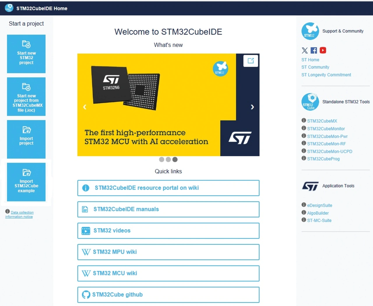 Der Startbildschirm nennt sich »STM32CubeIDE Home«. Von ihm aus lassen sich die wichtigsten Funktionen starten. Er lässt sich stets über »i – Home« (i-Zeichen und Haussymbol rechts) von der Menüleiste aus aufrufen.