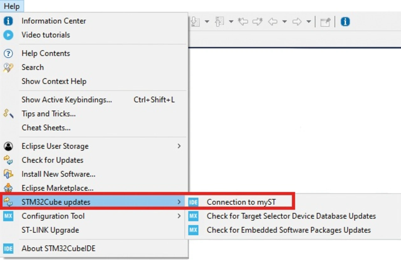 In den Anleitungen und den zahlreichen Videos zum Thema ist angegeben, dass die Anmeldung über den Button »myST« in der IDE in der Menüleiste (neben Help) erfolgt. Dieser Button ist seit der Version 1.17 dort aber nicht mehr zu finden, was in der Community zu vielen Diskussionen und oftmals fehlerhaften Vermutungen geführt hat. Stattdessen ist die Anmeldefunktion mit myST an eine andere Position verschoben worden, und zwar nach »Help – STM32Cube updates – Connection to myST«.
