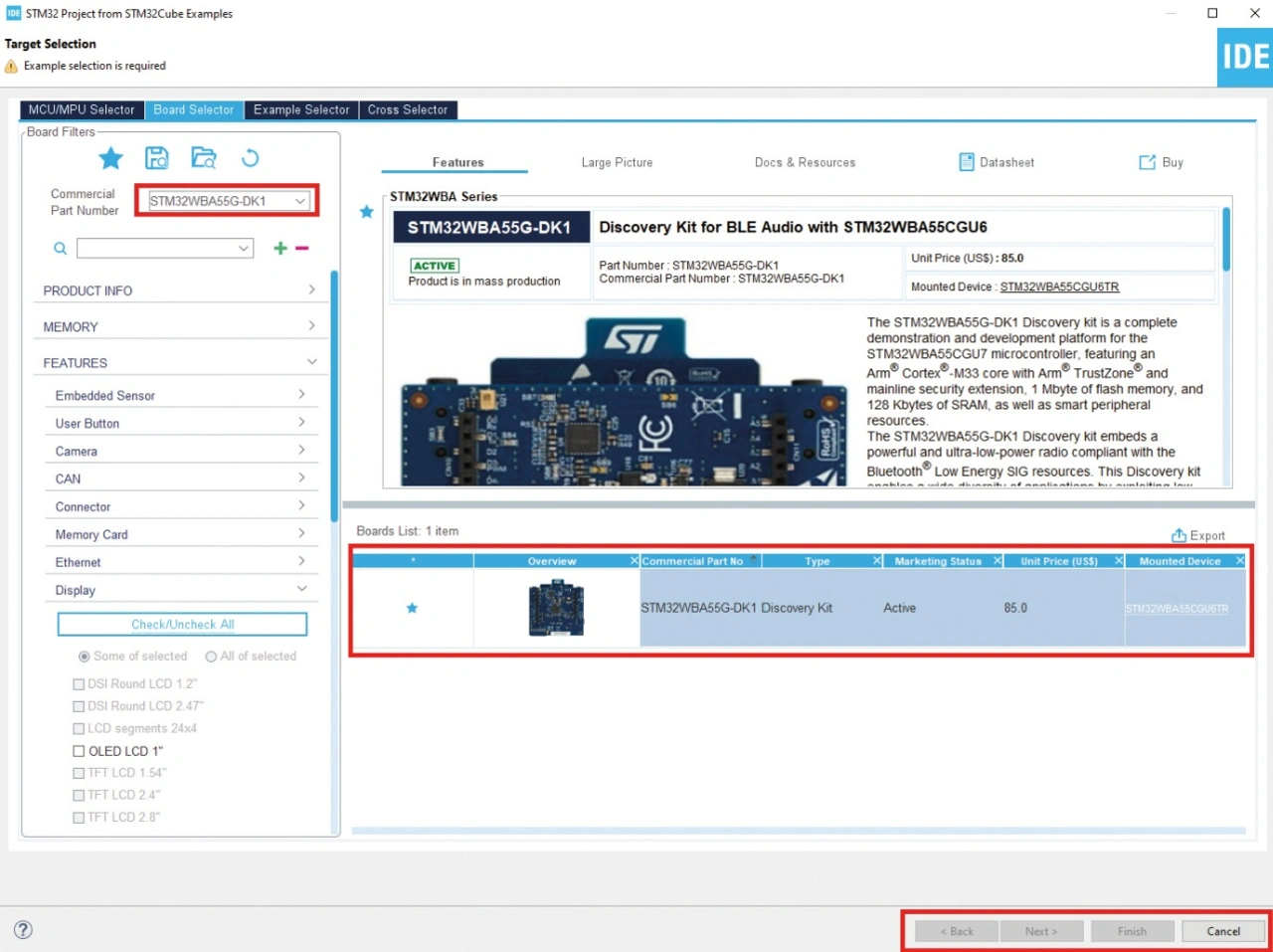 Bei einer selbst aufgebauten Schaltung ist klar, dass Elemente wie LED, Taster, Display oder auch Schnittstellen entsprechend anzugeben sind, woraus CubeMX den Initialisierungscode generiert. Diese Dinge stehen beim Einsatz eines unterstützten Developer Boards hingegen fest, weshalb es verwundert, dass diese Informationen nicht automatisch vom Target Selector weitergereicht werden, sondern in CubeMX anzugeben sind.