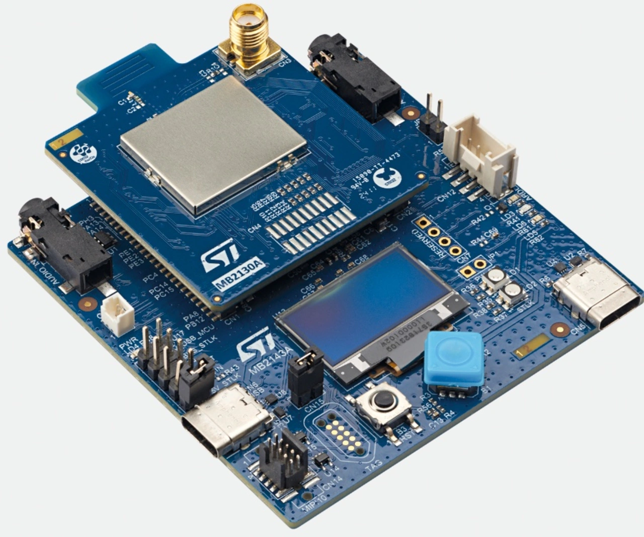 Das Entwicklungsboard setzt sich jeweils aus zwei Platinen zusammen, einer Trägerplatine (MB1802B, MB2143A) und einer darauf gesteckten Radioplatine (MB1803B, MB2130A), was als funktionale Einheit betrachtet wird. Auf der Trägerplatine arbeitet ein STM32F723 (Cortex M7), der eine STLINK-V3EC-Schaltung für die Programmierung und das Debugging auf dem Board integriert. Zur Peripherie zählen im Wesentlichen ein Reset-Taster, eine LED, ein Joystick, ein OLED-Display sowie ein Audioeingang (Mikrophon) und ein Audioausgang (Line Out). Die STLINK-Verbindung wird wie die Spannungsversorgung über einen USB-C-Anschluss hergestellt.