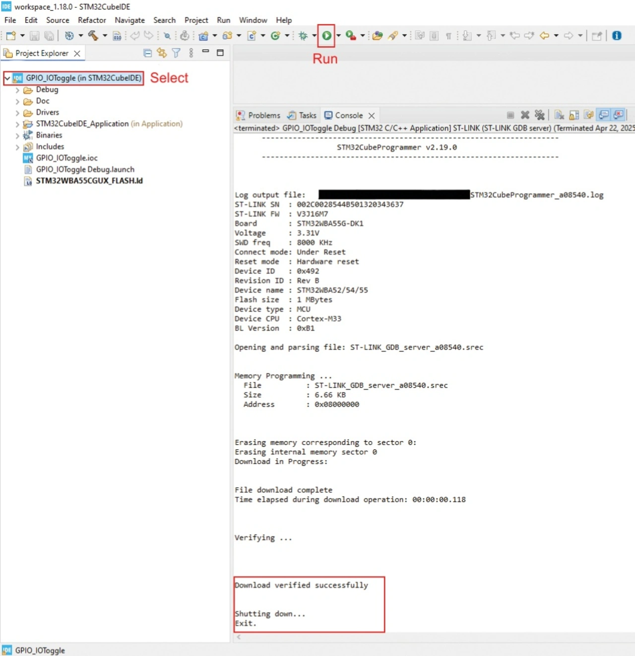 Für das neuere Board STM32WBA65I gibt es leider kein GPIO_IOToggle-Beispiel, dafür werden jedoch Bluetooth LE und auch Matter umfassend unterstützt, weshalb dieses Board im Folgenden verwendet wird, zumal die Matter-Unterstützung für das STM32WBA55G-DK1 mittlerweile eingestellt worden ist. Wichtig war das ältere Board dennoch, um damit die »STM-Eigenarten« zu ergründen, was mit dem erfolgreichen Flash-Vorgang (Bild 6) seinen Abschluss findet, sodass man sich der eigentlichen Aufgabe zuwenden kann.
