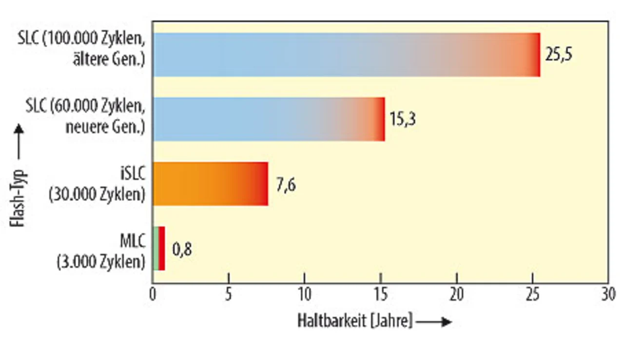 Bei NAND-Flash-Speicher gibt es zwei grundsätzliche Varianten: Single-Level Cell (SLC) und Multi-Level Cell (MLC). SLC ist die teurere und leistungsfähigere Spielart, während MLC billiger ist und traditionell eine schlechtere Performance und Haltbarkeit aufweist (Bild). Die kleinste Einheit in einem Flash-Speicher ist die Zelle. In SLC-Flash speichert eine Zelle nur ein Bit, was es einfach macht, diesen Zustand zu lesen und zu bestimmen. Die Konstruktion mit einem Bit pro Zelle von SLC führt zu eindeutig identifizierbaren Ladungszuständen, weshalb Lese- und Schreibvorgänge unkompliziert, schnell und zuverlässig stattfinden können. Abhängig vom Messverfahren besitzen SLC-Speicher eine zu erwartende Lebensdauer von typischerweise 60.000 bzw. 100.000 P/E-Zyklen.