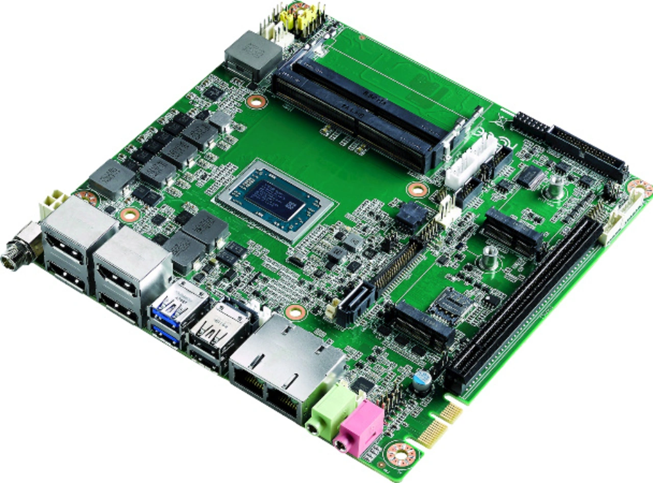 AMDs Prozessortechnologie ist daher für viele Embedded-Computing-Hersteller interessant, sodass man bei vielen Playern auch passende Embedded Boards und Module findet. Der derzeit weltweit So bietet Branchen-Schwergewicht Advantech die AMD R1000 Series, die Software- und Pin-Kompatibel zu AMDs Ryzen V1000 Series ist, beispielsweise auf einem Thin-Mini-ITX-Motherboard an, das beide Varianten unterstützt und damit eine sehr große Skalierbarkeit bietet. Gleicher Sachverhalt ist bei Kontron mit seinen mITX-VR1000-/mITX-VR1000-V2.0-Boards gegeben. Beide Angebote sind damit skalierbar vom 2,4-GHz-Ryzen-Embedded-R1505G (mit Radeon-Vega-3-Grafik, 2 Cores/4 Threads und einer TDP von 12 W bis 25 W) bis zum 3,35-GHz-Ryzen-Embedded-V1807B (mit Radeon-RX-Vega-11-Grafik, 4 Cores/8 Threads und einer TDP von 35 W bis 54 W). In Bezug auf die Leistung bedeutet dies, dass die Entwickler von 100% der einfachsten R1000-Variante auf rund 176% der schnellsten V1000-Version skalieren können, was die CPU-Leistung betrifft. Bei der GPU- und GPGPU-Performance ist die Skalierbarkeit noch deutlich größer. Hier reicht das Spektrum von 768 GFLOPS für den Ryzen R1505G bis hin zu 3,66 TFlops beim Ryzen V1807B, was 477 % mehr GFLOPS bedeutet. Dies ermöglicht ein für die jeweilige Anwendung optimiertes Verhältnis zwischen Preis, Leistungsaufnahme und Performance zu schaffen. Eine Alternative zu den Angeboten von Kontron und Advantech kommt von ASRock, das bei seinem IMB-R1000 Mini-ITX-Board auf die R-Series fokussiert aber auch ein IMB-V1000 anbietet. Aufgrund des identischen Formfaktors und der einheitlichen Schnittstellenausstattung bieten beide Boards abgesehen vom unterschiedlichen Grafiksupport nahezu identische Features.