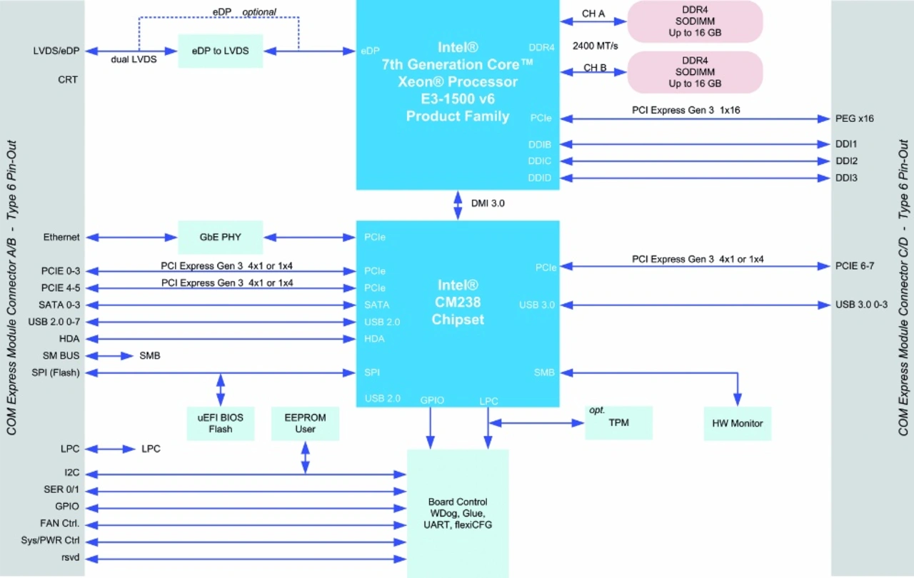 Um diese Prozessoren für Embedded-Anwendungen schnell und effizient nutzbar zu machen, bieten Embedded-Hersteller wie TQ entsprechende COM-Express-Module an. Das COM-Express-Basic-Modul TQMx70EB (Bild 1) deckt dabei alle Leistungsklassen der Prozessorfamilie ab – vom Core i3 bis hin zum Xeon E3-1500 v6. Das Modul kann mit bis zu 32 GB ultraschnellem DDR4-2400-Speicher ausgestattet werden, sodass auch genügend Ressourcen für rechen- und datenintensive Anwendungen zur Verfügung stehen. Für die Anbindung von externer Peripherie stehen bis zu 24 PCIe-Lanes zur Verfügung (Bild 2).
