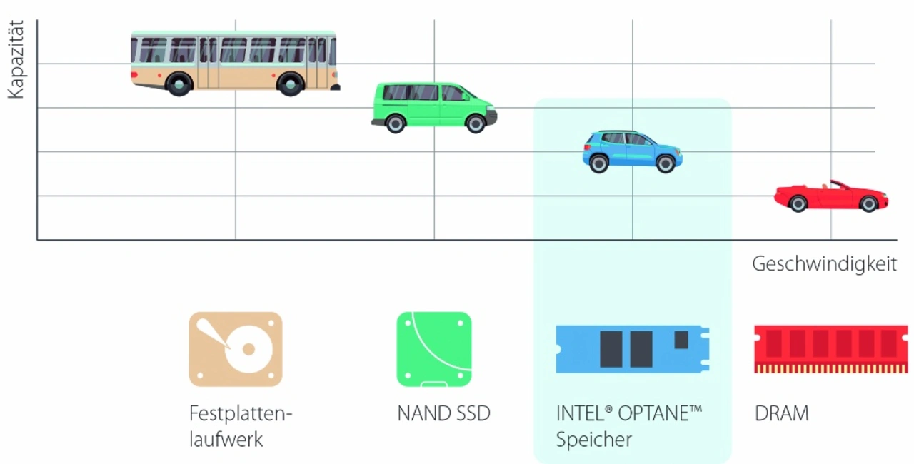 Wer für die dauerhafte Speicherung von sehr großen Datenmengen auf den Einsatz einer SATA-Festplatte angewiesen ist, kann für die kurzfristige Beschleunigung des Datentransfers auf Intels Optane-Speicher mit 3D-XPoint-Technologie zurückgreifen (Bild 4). Es handelt sich hierbei um eine neuartige Speichertechnologie, die eine sehr geringe Latenzzeit aufweist und sich unter anderem als Cache für die Datenübertragung zur Festplatte eignet. Die im M.2-Formfaktor erhältlichen Speichermodule werden erstmals mit der 7. Generation von Intels Core-Technologie unterstützt. Einige Anwender nutzen diese neue, nichtflüchtige Speichertechnologie aber auch, um den System- und Programmstart zu beschleunigen. Eine Kombination aus Software (Intel Rapid-Storage-Technologie) und Hardware bietet eine für den Anwender transparente Möglichkeit, häufig genutzte Daten nicht von der Festplatte, sondern aus dem superschnellen Optane-Speicher zu laden. Dadurch können Boot- und Ladezeiten für Anwendung drastisch sinken.