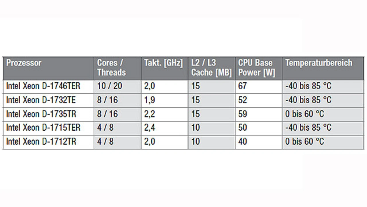 ➔ Fünf verschiedene Xeon-D-17xx-LCC-Prozessoren mit wahlweise vier bis zehn Kernen