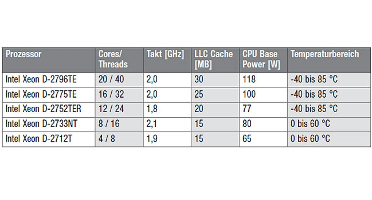 ➔ Fünf verschiedene Xeon-D-17xx-LCC-Prozessoren mit wahlweise vier bis zehn Kernen