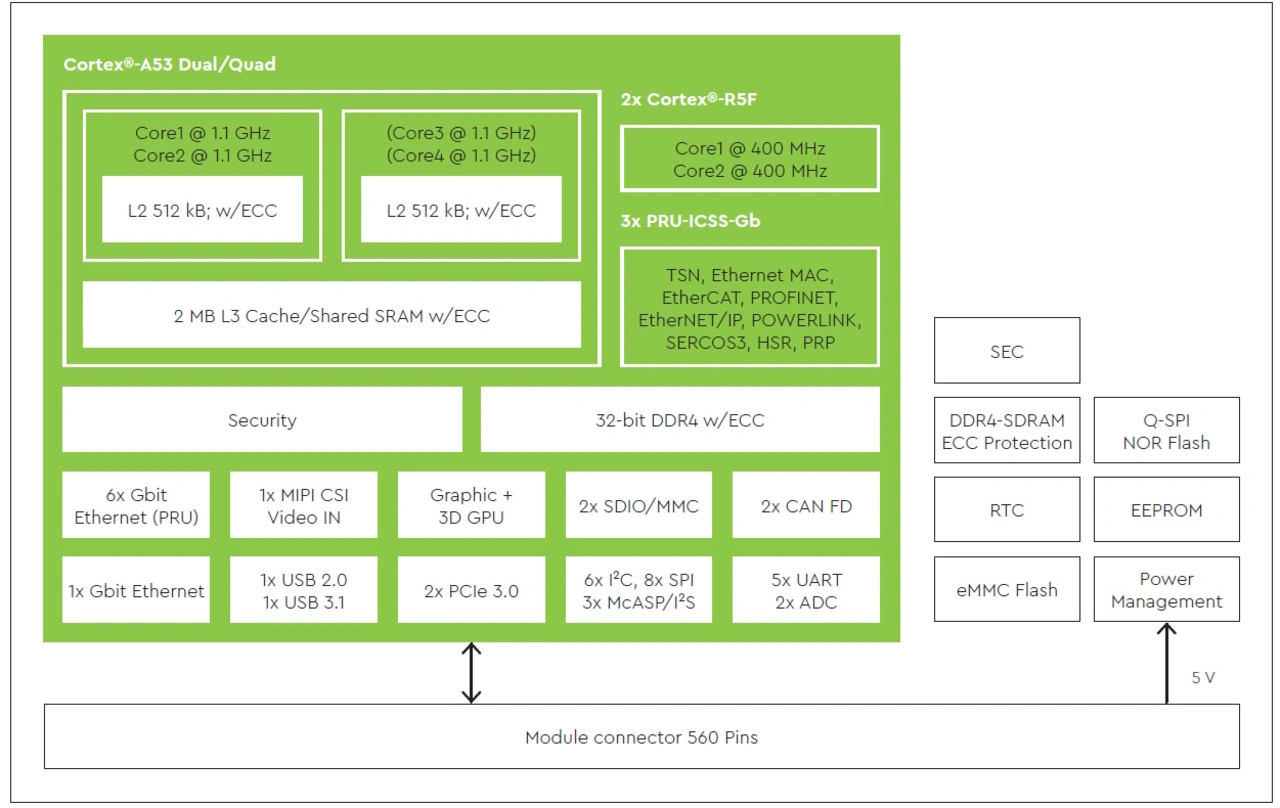 Kryptografische Beschleunigung und sicheres Booten sind auf dem AM65x zusätzlich zu den vom Device Management und Security Controller (DMSC) verwalteten granularen Firewalls verfügbar. Der Arm-Cortex-M3-basierte DMSC fungiert als Master für die Systemsicherheit und schützt Security Assets während der Laufzeit. Ergänzt wird das auf dem TQMa65xx um ein Secure-Element als Zusatzchip.