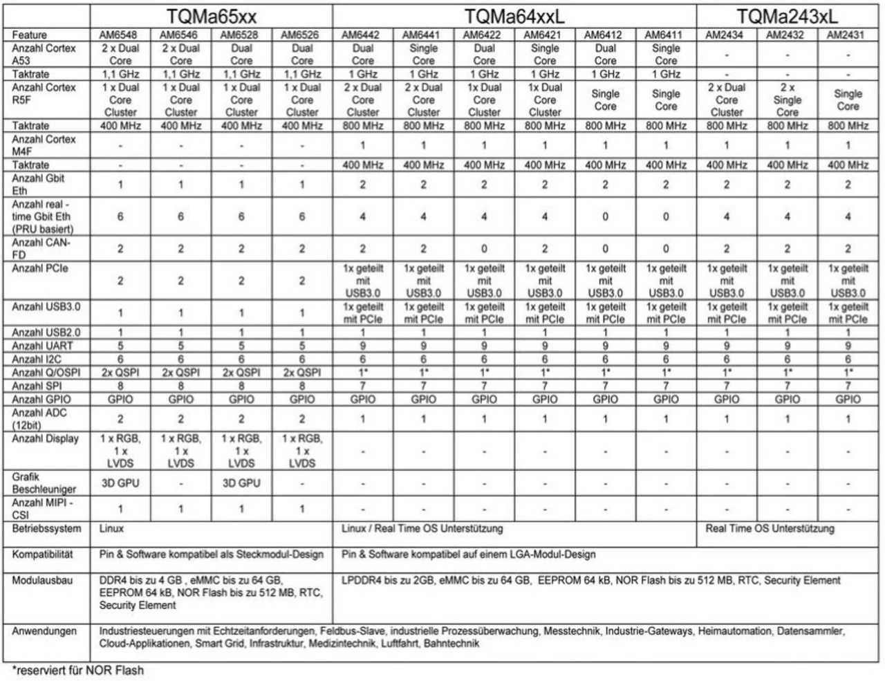 Betrachtet man die Skalierbarkeit der AM65x-Serie von Texas Instruments, muss man ebenfalls die Schwesterserien »AM64x« und »AM24x« einschließen. Sie sind beide für Headless-Applikationen ausgelegt, haben also keine energieintensive GPU und Display-/Monitor-Schnittstellen. Aufgrund ihrer Arm-R5F-Kerne eignen sie sich sehr gut für Echtzeitapplikationen. Sie teilen sich nicht nur viele Hardware-Komponenten mit der AM65-Serie, auch die Softwareentwicklungsumgebung ist dieselbe. Hiermit können Entwickler ohne Tool-Bruch über die unterschiedlichen Bausteinfamilien hinweg arbeiten. Die Tabelle zeigt die Skalierbarkeit im praktischen Einsatz als TQ-Modul.
