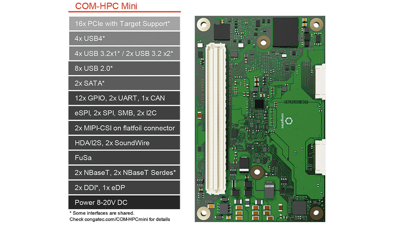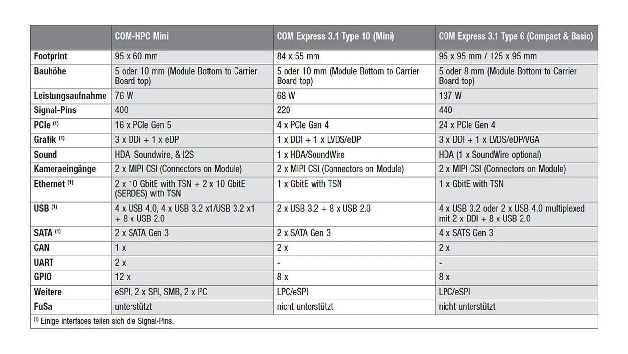 Bei der Anzahl der Pins stehen mit 400 Pins zwar 40 weniger als bei COM Express Type 6 (440) bereit. Trotzdem profitieren Entwickler von Bandbreitengewinnen und einer größeren Schnittstellenvielfalt. Hierdurch relativiert sich der nominelle Rückgang der PCIe Lanes von 24 bei COM Express Type 6 auf 16 Lanes bei COM-HPC Mini. Das Schnittstellenpaket haben die meisten Systemdesigns mit kompakter Bauart ohnehin so gut wie nie ausgeschöpft. Vorhandene Schnittstellen bei COM-HPC Mini sind unter anderem: