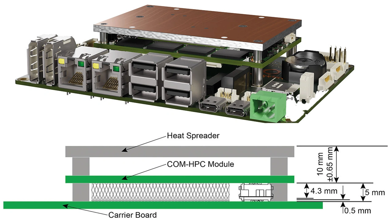 Auf die Breite des Moduls bezogen sind das 25 mm, die zu viel sind, um bestehende COM-Express-Designs allein vom Footprint betrachtet hin zu COM-HPC Client zu migrieren. Weil COM Express Compact der am weitesten verbreitete COM-Express-Formfaktor ist und in der Regel lediglich das High-End derzeit noch den größeren Formfaktor COM Express Basic nutzt, scheiterten viele Entwickler allein beim Dimensionieren des Systems. Kleiner geht jedoch immer. Aus dem Grund ist COM-HPC Mini mit seinen 95 mm x 60 mm vor allem für die vielen Systemdesigns in kompakter Bauart ein Befreiungsschlag, der vollkommen neue Perspektiven eröffnet.