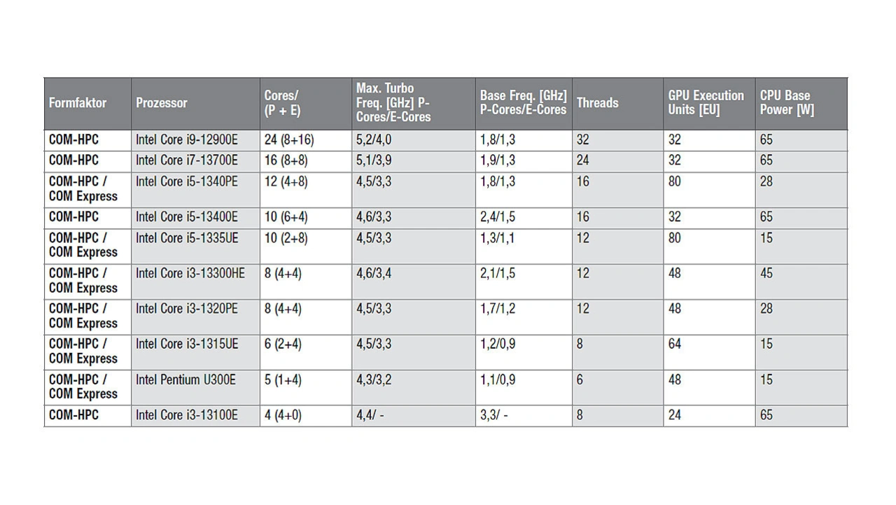 Im Vergleich zu Intels Core-Prozessoren der 12. Generation bieten die neuen COM-HPC und COM Express CoMs mit gelöteten Prozessoren der 13. Generation verschiedene Vorteile: Zum Ersten stellen sie Intels Hybridarchitektur erstmals robusten Designs im industriellen Temperaturbereich von -40 bis +85 °C bereit. Zum Zweiten bieten sie laut Intel bis zu acht Prozent mehr Singlethread- und bis zu fünf Prozent mehr Multithread-Leistung. Der Zuwachs geht mit dem verbesserten Fertigungsprozess einher in Verbindung mit einer höheren Energieeffizienz.