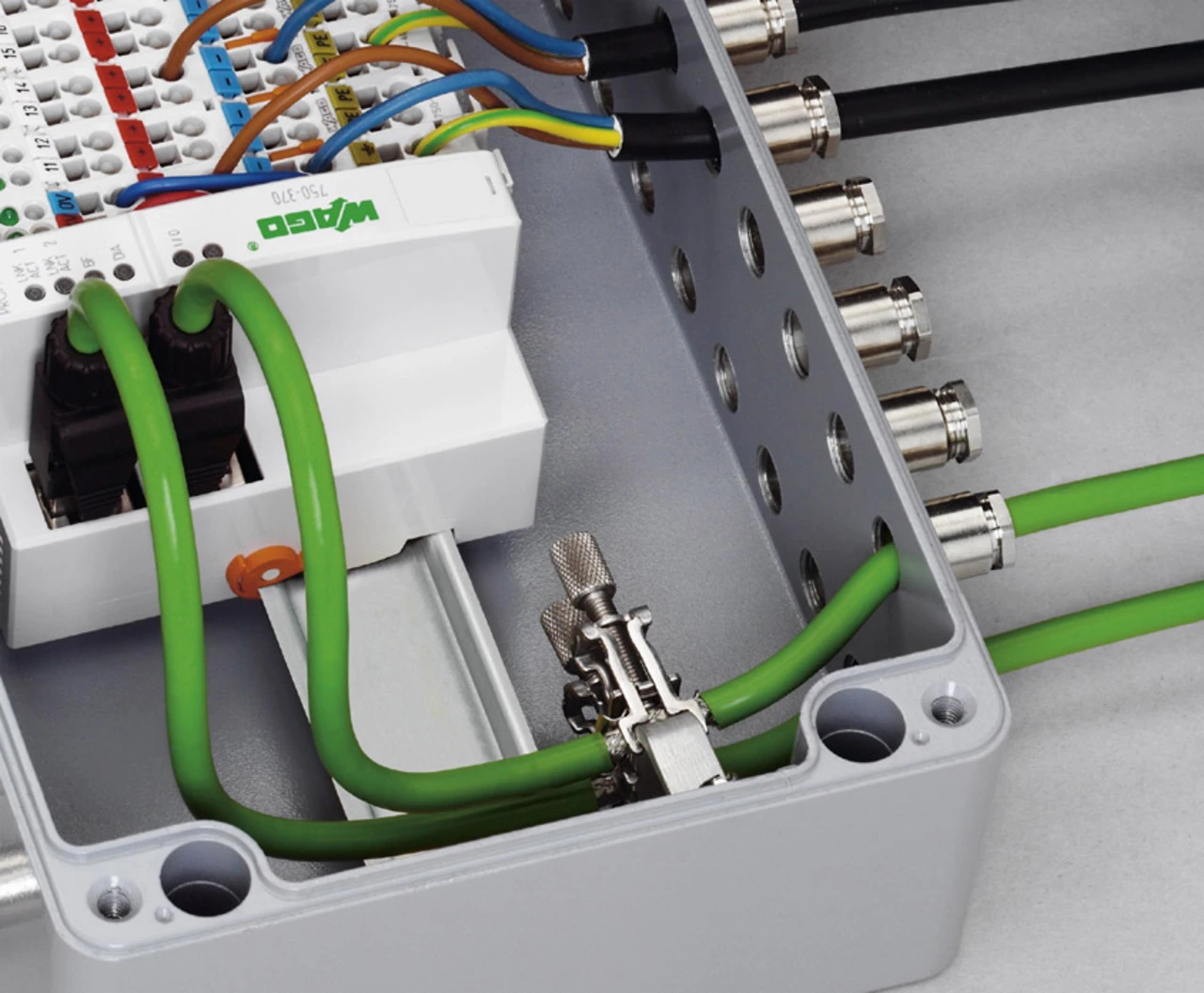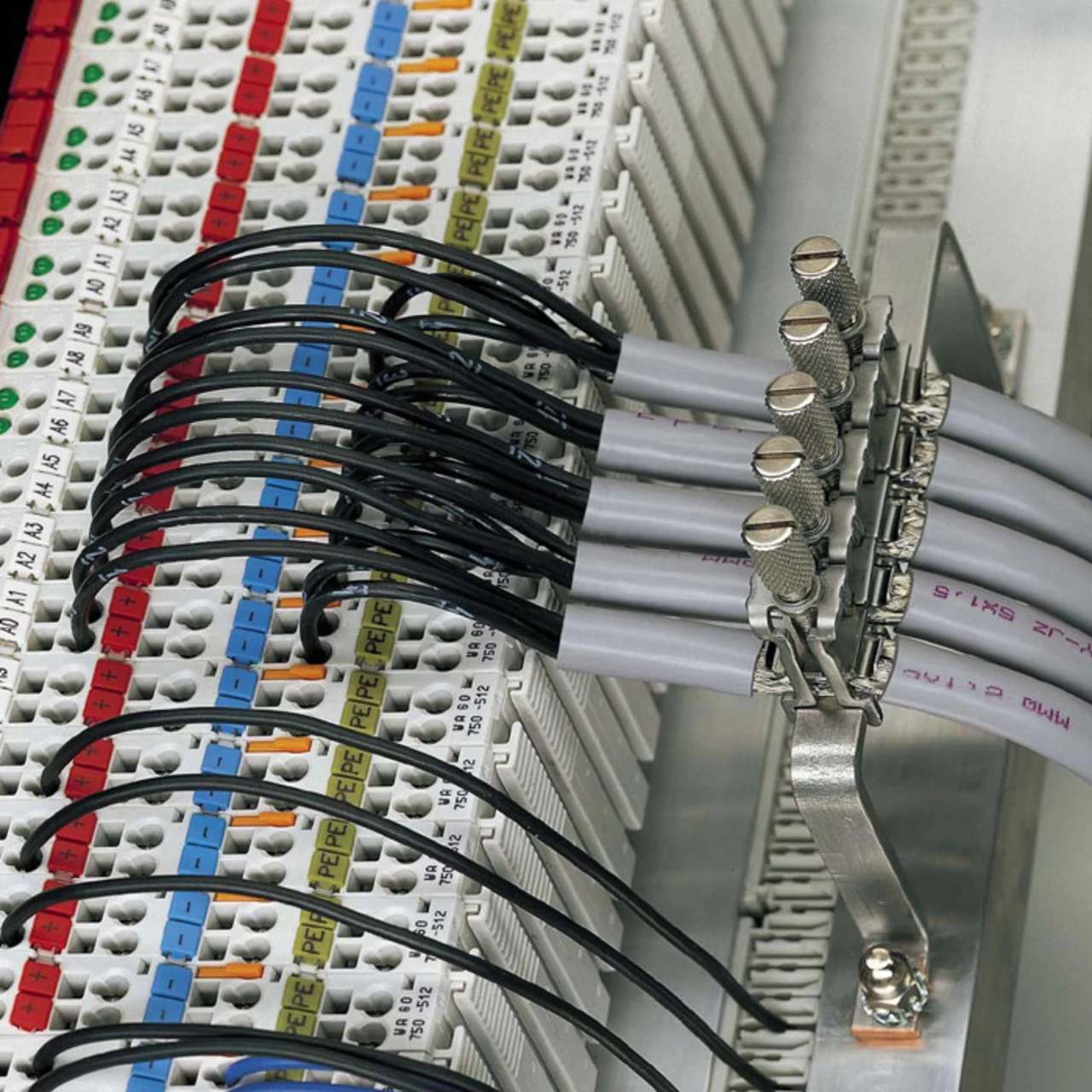 Wie ein solches Schirmanschlusssystem aussehen kann, zeigen die Serien 790 und 791 von Wago beispielhaft. Durch unterschiedliche Befestigungssysteme und Schirm-Klemmbügel bis 40 mm Schirmdurchmesser kann die Schirmauflage abhängig von der Störbeeinflussung sehr dicht an den eigentlichen Verbindungsstellen oder in der Nähe der Kabeldurchführung erfolgen. Anwender wählen die passende Art der Befestigung der Einbausituation entsprechend. Die Schirm- Klemmbügel leiten wegen ihres großflächigen und niederimpedanten Anschlusses auch hochfrequente Störströme sicher ab.