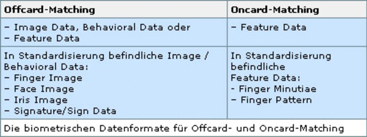 Neben den Finger-Minutien-Formaten ist mit dem Finger-Pattern-Format (Teil 3) ein weiteres Format auf Merkmalsebene („Feature data“) spezifiziert, das aber eine globale Präsentation des gesamten Bildes darstellt, ohne eine reduzierende Auswahl von Merkmalsdaten zu treffen. Die Standardisierung und weitere Verbreitung des Formats wird durch Patente erschwert. Zudem liegen vermutlich keine Erfahrungen mit Oncard-Matching vor. Das Polar-Format der Iris Image Data (Teil 6) liegt mit einer Datengröße um 2 Kbyte nahe an einer zulässigen Größe von Oncard-Datensätzen. Bei den vorgesehenen Unterschriftsdaten (Teil 7) werden bisher ebenfalls nur Rohdaten spezifiziert, die aber aufgrund ihrer Struktur mögliche Relevanz für Oncard-Matching besitzen. Im Bereich Unterschriften und Iris werden in näherer Zukunft Formatentwürfe auch auf Merkmalsebene erwartet. Die übrigen bisherigen Entwürfe des Multipart-Standards haben Datenformate („Image data“, „Behavioral data“), die für Smartcards (insbesondere für Oncard-Matching-Verfahren) weniger relevant sind. Zusammenfassend zeigt die Tabelle die in der Standardisierung befindlichen Datenformate.