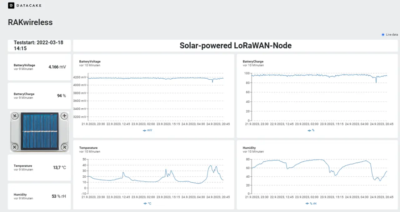 Die Motivation für den solarbetriebenen Sensorknoten war, herauszufinden, ob sich auch bei nicht optimaler Sonneneinstrahlung eine hinreichende Batterielaufzeit für einen Sensorknoten erreichen lässt. Hierzu wurde mit dem »RAKBox-B2«-Gehäuse mit Solarpanel (Bild 3) ein solarbetriebener LoRa-WAN-Knoten aufgebaut. Zum Einsatz kamen die Komponenten gemäß Tabelle 2. Überwacht werden die Batteriespannung und der Ladezustand der Batterie sowie die Temperatur und relative Luftfeuchtigkeit im Inneren des Gehäuses.