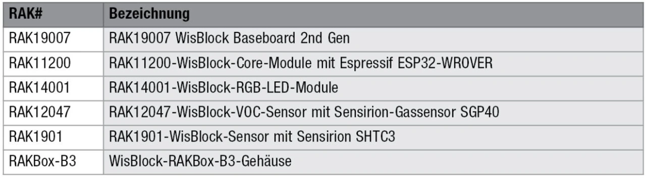 WisBlock bietet alle erforderlichen Komponenten für den Aufbau eines Sensorknotens zum Messen der Luftqualität (Air Quality Node). Tabelle 3 zeigt die verwendeten Komponenten, Bild 5 zeigt das Baseboard RAK19007 mit »RAK11200«-Core-Modul sowie Sensor- und RGB-LED-Modul in der RAKBox-B3 montiert.