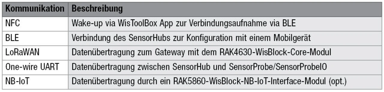 Ein Beispiel ist ein SensorHub mit angeschlossener SensorProbe, die mit den WisBlock-Sensoren »RAK1901« und »RAK1902« ausgestattet ist. Hiermit können Entwickler über die SensorProbe Temperatur, relative Luftfeuchte und barometrischen Druck erfassen. Der SensorHub stellt zwei Varianten der Kommunikation in einem LPWAN zur Verfügung. Die Basisvariante ist LoRaWAN und die Erweiterung durch ein »RAK5860«-WisBlock-NB-IoT-Interface-Modul bietet zusätzlich NB-IoT.