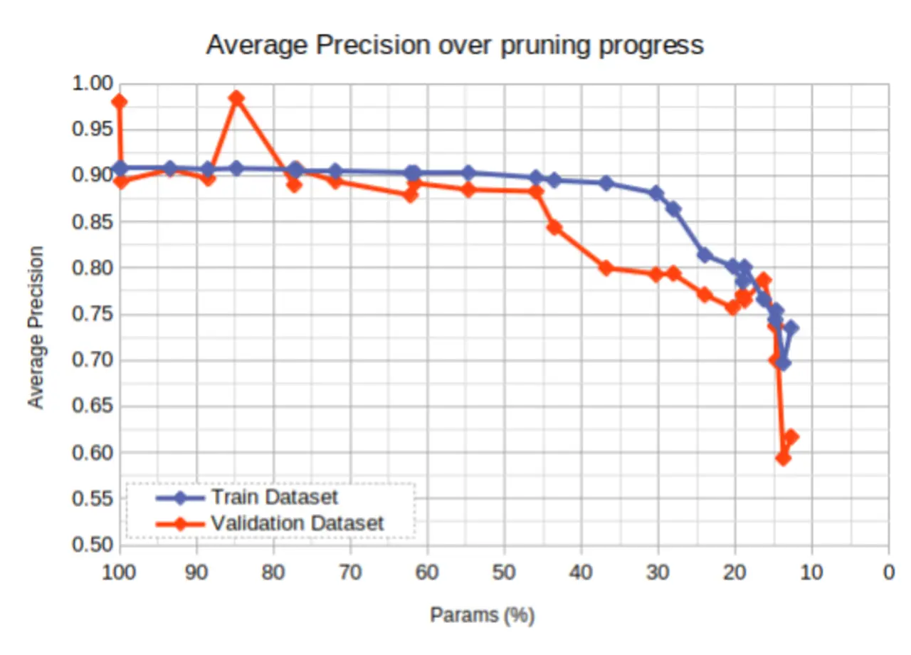 Bild 4 zeigt die Reduktion von Parametern über den Pruning-Prozess hinweg im Vergleich zur durchschnittlichen Präzision des Modells. Weil der Validierungsdatensatz im gezeigten Fall sehr klein ist, bildet er die Gesamt-Performance der gewünschten Anwendung nicht optimal ab. Aus dem Grund setzten die Entwickler den Trainingsdatensatz ein, um die Modellgenauigkeit im Vergleich zu messen – der Fortschritt zeigt ein plausibles Verhalten. Je mehr Convolution-Filter entfernt wurden, desto kleiner wurde das Modell. Jeder Punkt im Graphen entspricht einem gespeicherten Modell nach dem Pruning.