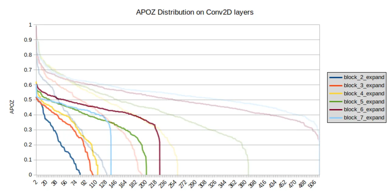 Bild 5 zeigt die Verteilung der APoZ-Werte (Aktivitätsprofil) ausgewählter Conv2D-Schichten des trainierten Modells vor und nach dem Pruning. Auf der Y-Achse ist der APoZ-Wert dargestellt, die Anzahl an Filtern auf der X-Achse. Wie in der Legende zum Bild beschrieben, sind unterschiedliche Conv2D-Schichten in unterschiedlichen Farben dargestellt. Wie bereits erwähnt, war die Anzahl an Filtern pro Schicht auf 512 beschränkt, was dem Maximalwert auf der X-Achse entspricht. In absteigender Reihenfolge wurden die Werte pro Schicht sortiert. Während ein APoZ-Wert von null einer 100-Prozent-Aktivierung entspricht, zeigen Werte nahe eins an, dass Filter selten aktiviert werden und somit nicht relevant für die finale Ausgabe des Modells sind.