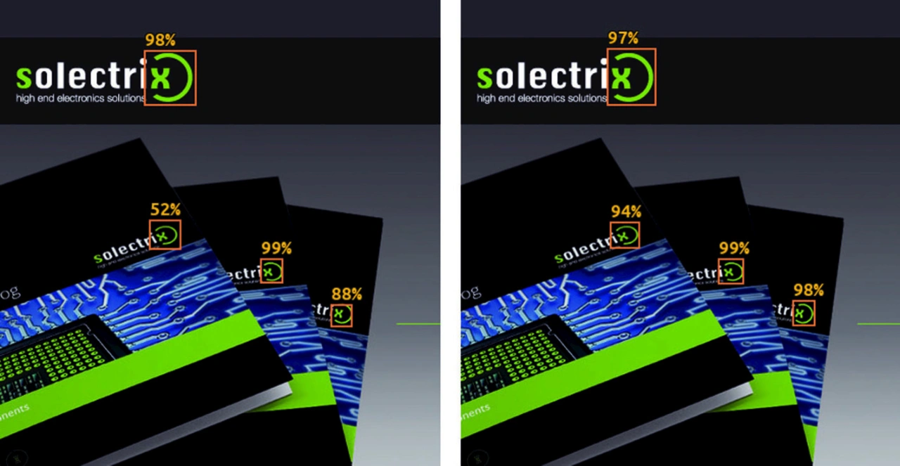 Ein zweiter Vergleich zwischen dem Netz nach Training und Pruning – als Inferenzbeispiel auf dem ZCU102 Evaluation Board – ist in Bild 6 zu sehen. Wie zu sehen ist, können beide Netze überzeugend die vier Solectrix-Firmenlogos in verschiedenen Größen und Winkeln innerhalb des Testbildes erkennen. Alle Erkennungen sind durch ihre entsprechenden Rahmen markiert. Zudem wird die Netz-Confidence (Zuversicht) angegeben. Wie zu sehen, haben sich die Confidence und die Position der Erkennungskästen zu einem gewissen Grad verändert. Allerdings erkennt der Algorithmus – trotz der gewaltigen Reduktion der Modellgröße – weiterhin alle vier Solectrix-Logos.