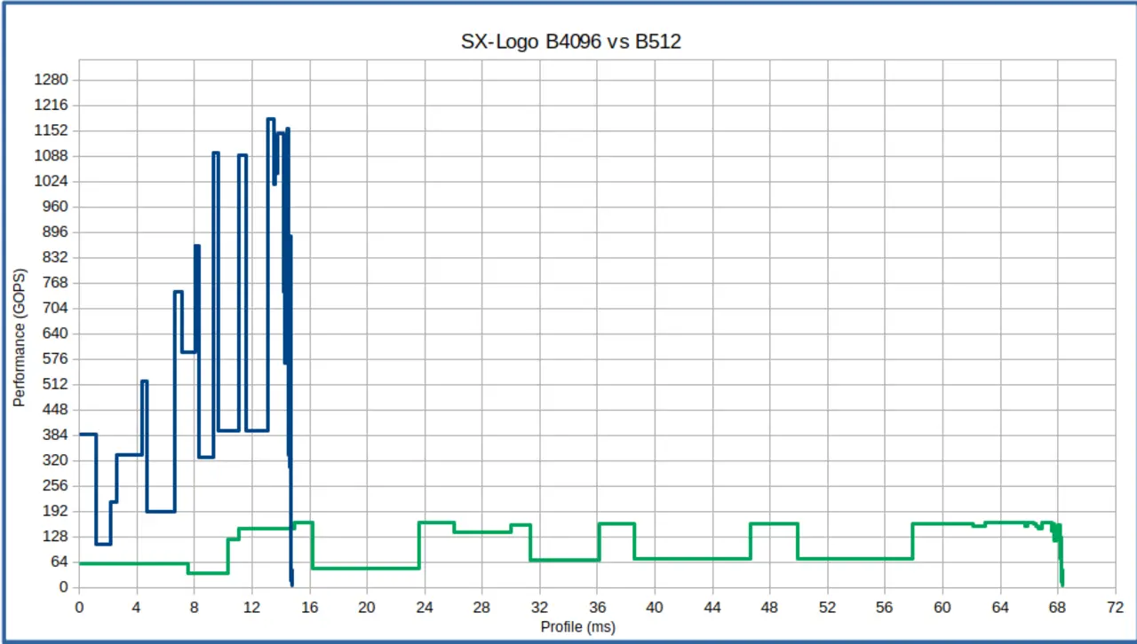 Bild 7 vergleicht die Performance und die Laufzeit für die zwei betrachteten DPU-Konfigurationen. Hierbei ist die Performance von B512 in grün gezeigt, die von B4096 in blau. Wie zu sehen, ist die totale Inferenzzeit von B512 etwa 68 ms. Im Gegensatz dazu ist die Inferenzzeit für B4096 etwa 15 ms. Somit ist der Laufzeitdifferenzfaktor zwischen den zwei Konfigurationen etwa 4,5 und unterscheidet sich deutlich vom theoretisch optimalen Faktor 8,0. Zusätzlich ist zu sehen, dass die Performance nicht konstant ist, sondern für die verschiedenen Netzschichten variiert.