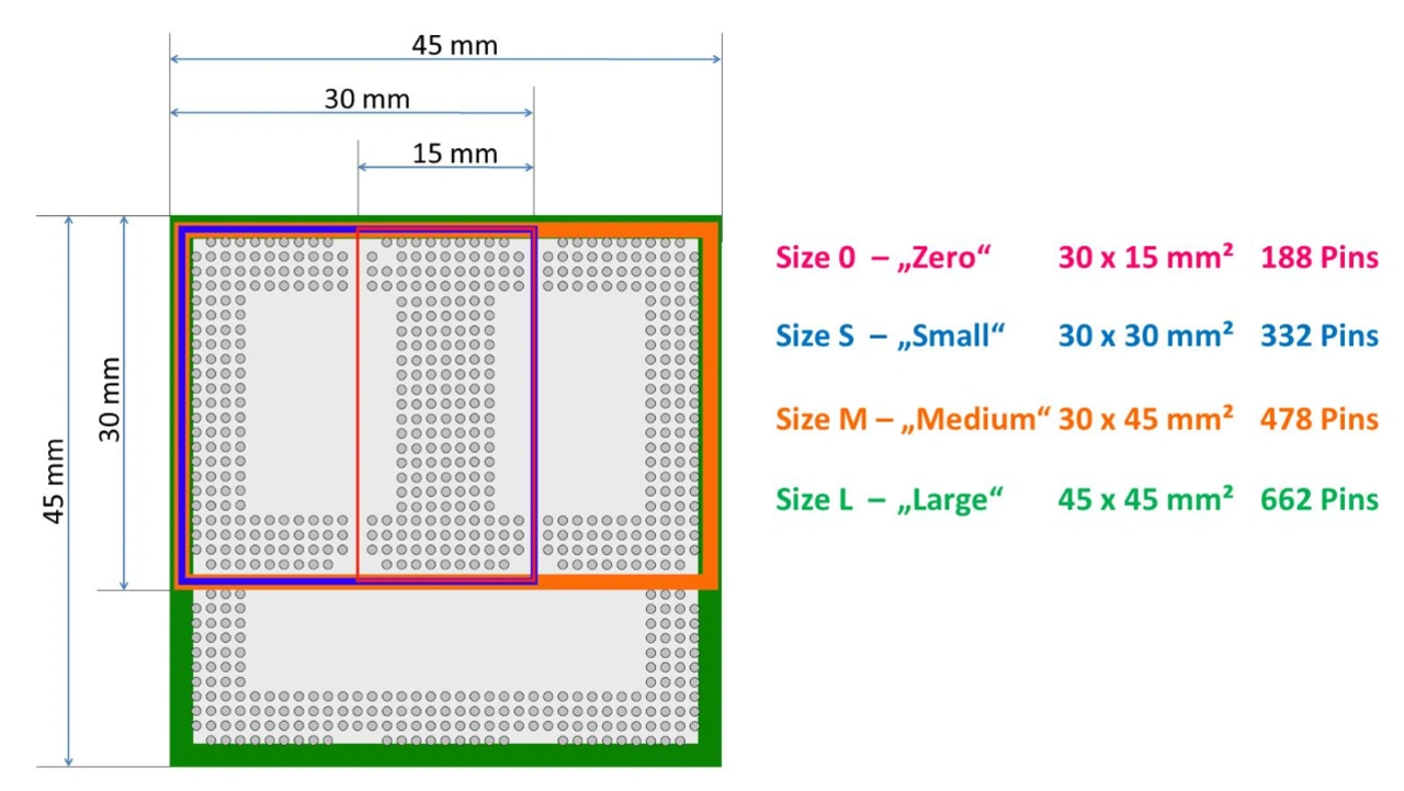 Die Standardization Group for Embedded Technologies (SGET) hat daher schon vor einigen Jahren den Formfaktor Open Standard Module (OSM) definiert. Die Module sind ähnlich wie ein Prozessor im LGA-Gehäuse direkt auf die Basisplatine (Carrier Board) auflötbar. Dies ermöglicht höhere Pindichten trotz deutlich kleinerer Abmessungen. Zusätzlich entfällt noch der Kostenfaktor »Stecker«, und die dadurch mögliche vollständige Automatisierung von Bestücken, Löten (ersetzt das manuelle Einstecken) und Testen sorgt für weitere Einsparungen. Der Hauptvorteil der OSM-Module gegenüber den gesteckten CoMs liegt jedoch in den wesentlich kleineren Baugrößen der vier aufeinander aufbauenden Modulvarianten: Selbst die größte davon, »Size L«, benötigt mit 45 x 45 mm² weniger als die Hälfte des Platzes des kleinsten SMARC-»Short«-Moduls mit 82 x 50 mm². Das alles bei rund doppelter Pinzahl von 662 gegenüber den 314 Pins.