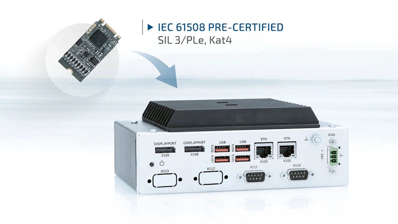 Für die funktionale Sicherheit bietet der Embedded-Spezialist ab sofort die M.2-2242-Erweiterungskarte. Sie bietet eine modulare und universelle Sicherheitssteuerung bis SIL Level 3 beziehungsweise PLe Kat4 und enthält vorkonfigurierte Sicherheitsfunktionen. Zudem lässt sie sich in unterschiedliche Rechnerplattformen integrieren. Kontron bietet hierfür einen nach IEC 61508 vorzertifizierten Industrie-PC als Application-Ready-Plattform für anwendungsspezifische Applikationen an – vor allem für große OEMs interessant. So verschmelzen Steuerung (IPC) und Safety zu einer systemoffenen, platzsparenden und modular erweiterbaren Sicherheitssteuerung.