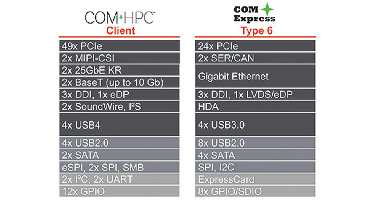 Mit dem Plus an Schnittstellen ist noch lange nicht das Ende von COM-HPC-Client-Modulen erreicht, denn gut 40 der 800 Pins sind heute noch nicht belegt. COM-Express stößt hingegen mit seinen 440 Pins an seine Leistungsgrenzen. COM-HPC-Modulen gehört deshalb überall dort die Zukunft, wo die Anforderung an Embedded Computer und somit an die Anzahl der erforderlichen Schnittstellen steigt. Ansonsten profitieren beide Formfaktoren von den neuen Prozessoren der Tiger-Lake-H-Generation.