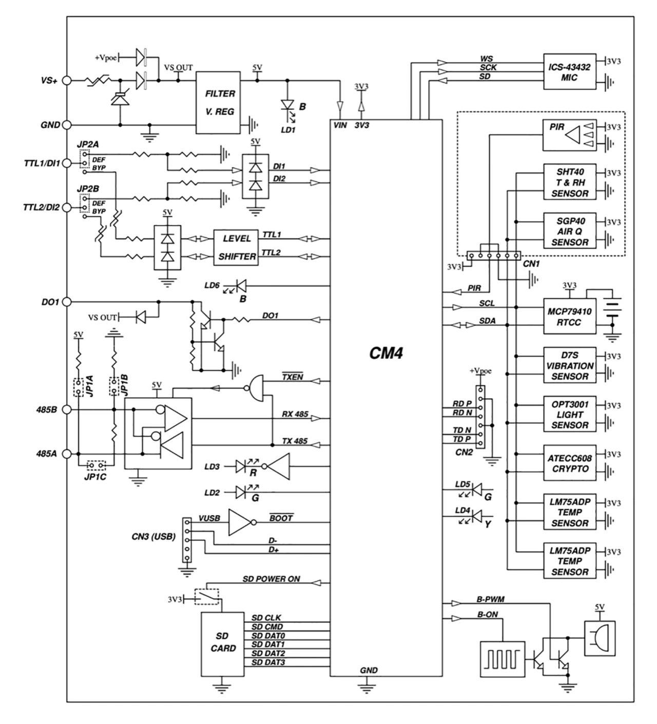 Neben den internen Sensoren verfügt der Sensor über externe Schnittstellen, zum Beispiel eine serielle RS-485-Schnittstelle, die mit dem UART des CM4 verbunden ist. Hinzu kommen zwei 5V-I/O- oder generische Digitaleingänge zum Anschluss von Ein-Draht-Sensoren oder einem Wiegand-Tastatur-/Badge-Leser. Ebenso ist ein Open-Collector-Ausgang zum Steuern kleiner Lasten oder eines externen Leistungsrelais enthalten.