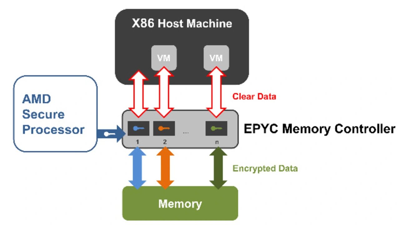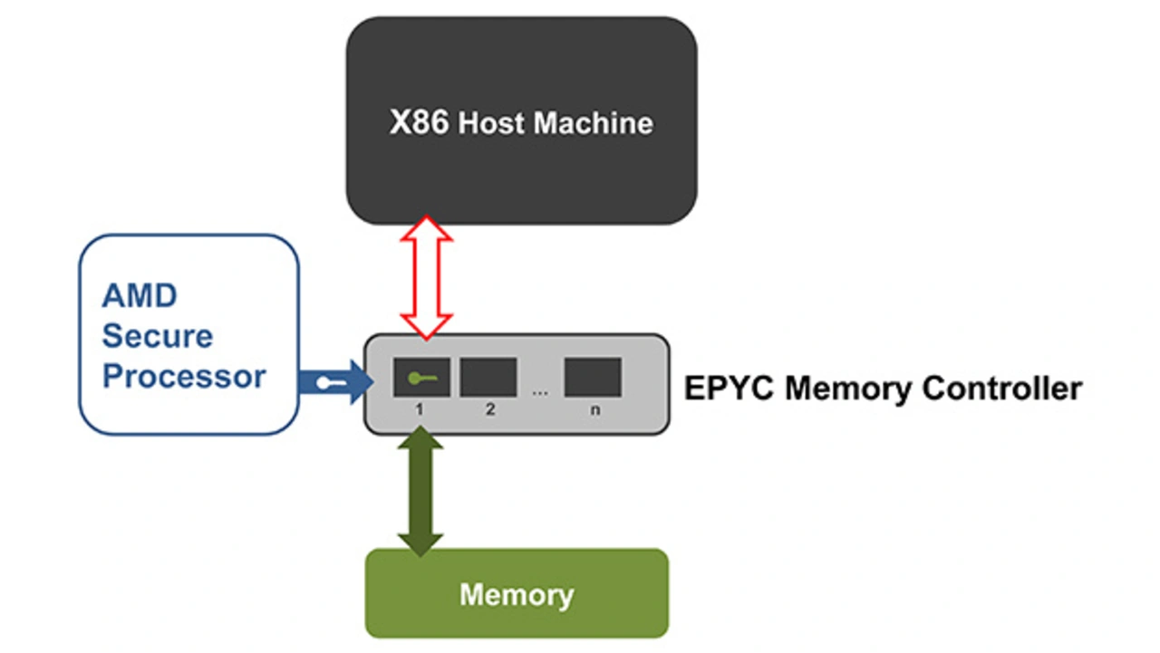 Ein weiteres Sicherheitselement, das über den Co-Prozessor für Sicherheitsfunktionen bereitgestellt wird, ist die SME (Bild 4). Sie hilft beim Schutz vor Angriffen auf die Integrität des Hauptspeichers, beispielsweise Kaltstartangriffen. Angreifer können so selbst bei einem physischen Zugriff auf die Systeme, den Inhalt des Systemspeichers nicht in Klartext auslesen. Ein physischer Zugriff ist bei dezentral installierten Infrastrukturen einfacher zu erreichen als bei abgesicherten Rechenzentren. Die Ingenieure integrierten die Verschlüsselungs-Engine direkt in den Speichercontroller, um die Geschwindigkeit des Speicherzugriffs besonders performant zu gestalten. Also ist der Sicherheits-Co-Prozessor eine Teilfunktion des Speichercontrollers. Vorteilhaft ist zudem die Tatsache, dass Anwender die SME ohne jedwedes Anpassen von Software nutzen können – weder beim Hypervisor noch beim Gast-Betriebssystem oder der Anwendungs-Software.