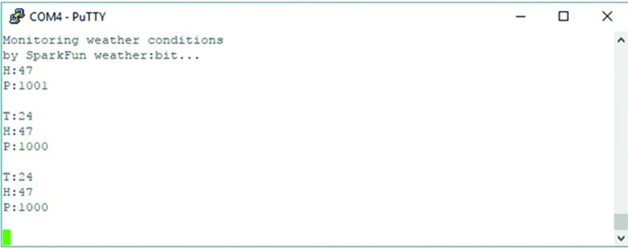 In einer Endlosschleife erfolgt nacheinander die Abfrage von Temperatur, Feuchtigkeit und Druck. Das Muster ist dabei immer gleich. Der vom jeweiligen Sensor erfasste Wert wird skaliert in der betreffenden Variablen abgelegt, die dann seriell ausgegeben wird. Darauf folgt eine Pause von 100 ms. Nach der Ausgabe des letzten Messwerts erfolgt noch die Ausgabe einer Leerzeile und eine Pause von einer Minute, bis sich der Vorgang wiederholt.